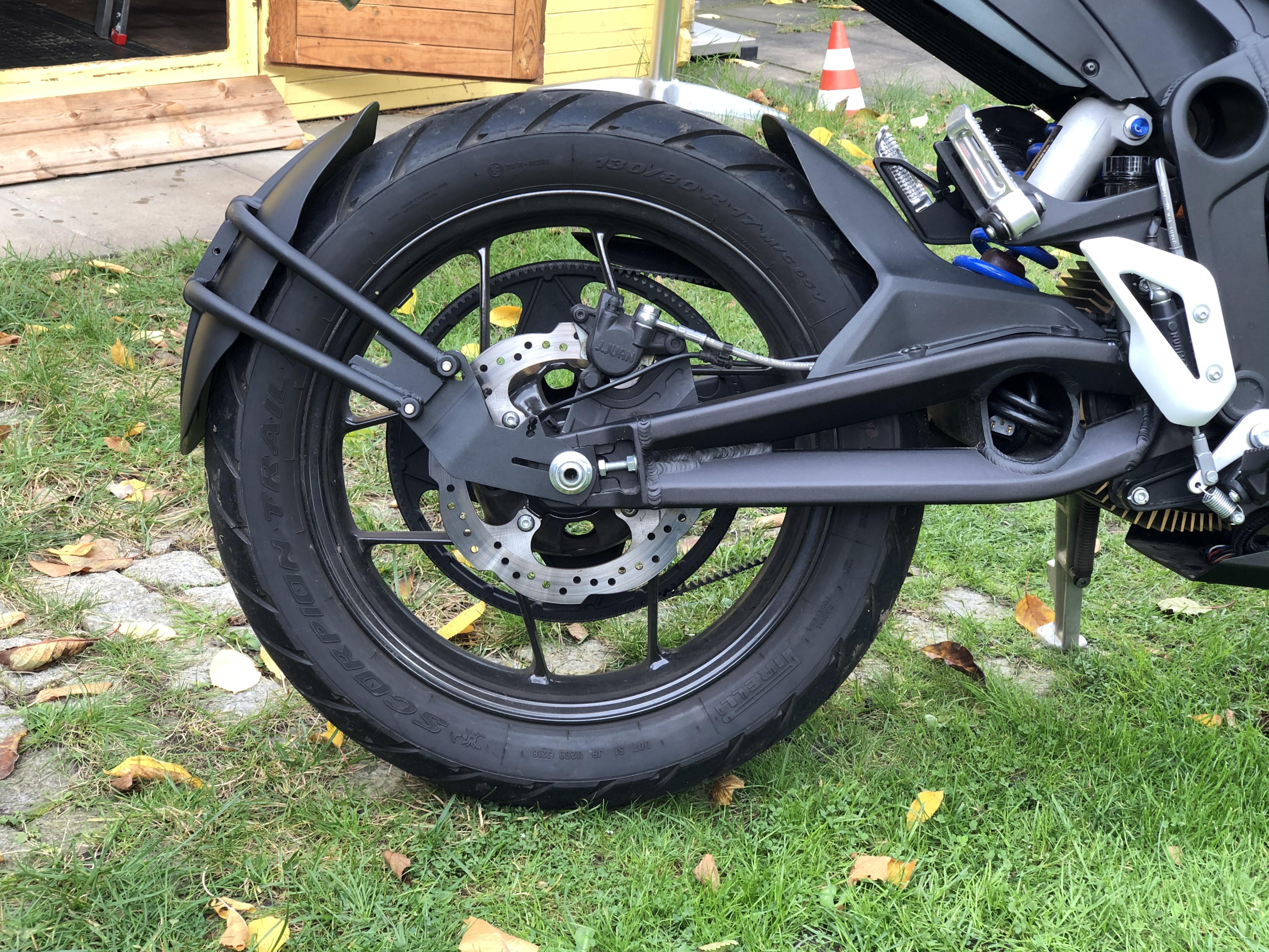 Die Kühlrippen des Motors bleiben deutlich sauberer. Das Entfernen der Beete aus den Rippen wird nicht nach jedem Regen nötig. Allergings wäre ein noch längerer hinterer Kotflügel hilfreich, damit wir nicht immer mit der Streifenhörnchenzeichnung auf dem Rücken nach einer Fahrt auf nasser Straße absteigen. Die wird mit dem Teil aus China noch nicht vermieden.