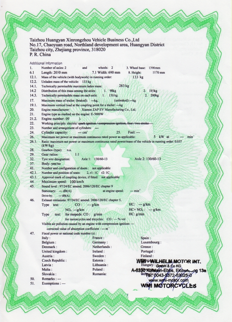 Das nützt Dir zwar nicht viel, weil jeder Hersteller wieder ein anderes Format verwendet, und weil ich keine Super Soco besitze, aber, die ein besitzen haben sich hier ja noch nicht Wort gemeldet. Habe natürlich Kennzeichen, Rahmen- und Motornummer unkenntlich gemacht, aber das hier ist z.B. die doppelseitige CoC von meinem verrenteten E-Pferdchen Fury (Thunder) aus China: