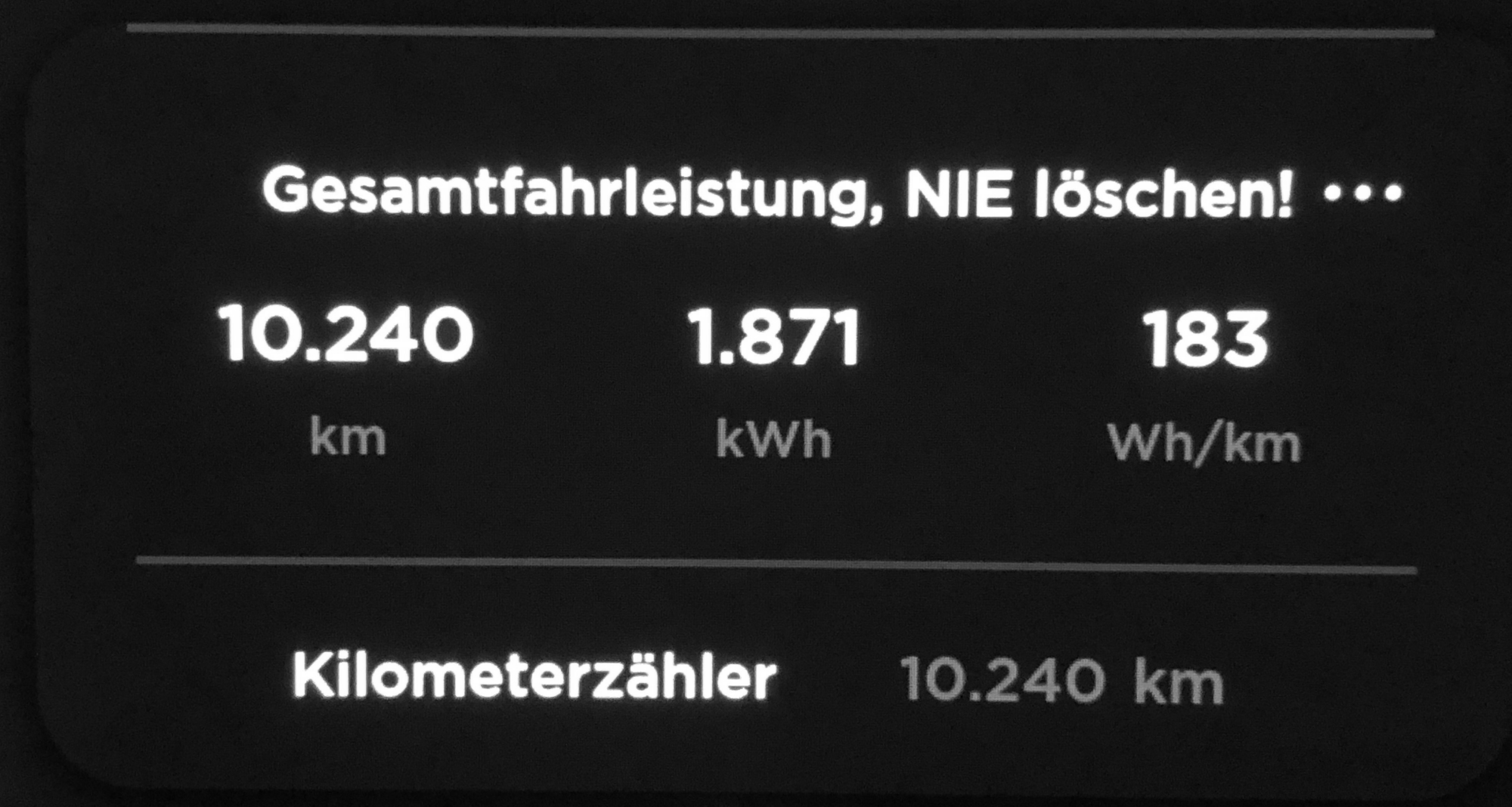 Unser Model 3 LR RWD auf den ersten 10000km. "Nur" 183Wh/km, weil wir mit Spaß fahren. Andere mit Hinterradler mit großer und besonders kleiner Batterie kommen auf derselben Strecke mit unter 150Wh/km aus. 250Wh/km geht nur bei ganz saumäßigem Fahren