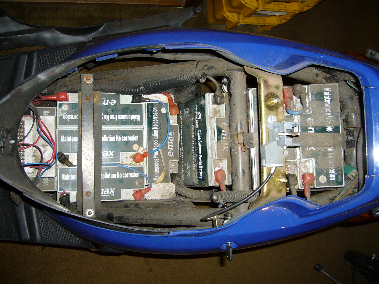 UNTER der Sitzbank sollten KEINE Batterien sein! Falls doch handelt es sich um eine Uraltversion des E-max mit veraltetem Controller (schlechtere FET's m. höherem RSon = schlechterer Wirkungsgrad) und auch abweichender (und teils kurioser) Akku-Ladeschaltung. Die Akkus werden separat geladen und bei Zündung=Ein parallel geschaltet. Beim Laden mit ZWEI Ladegeräten UND Zündung=Ein kann es zu groben Fehlern kommen, weshalb die neueren E-max 1500 (keine Batt. unter der Sitzbank!) die Relais trennen, sollte min. ein Ladegerät gesteckt sein. Tipp: nur mit EINEM Ladegerät aufladen (wechselweise). Dauert natürlich länger, könnte aber sicherer sein...
