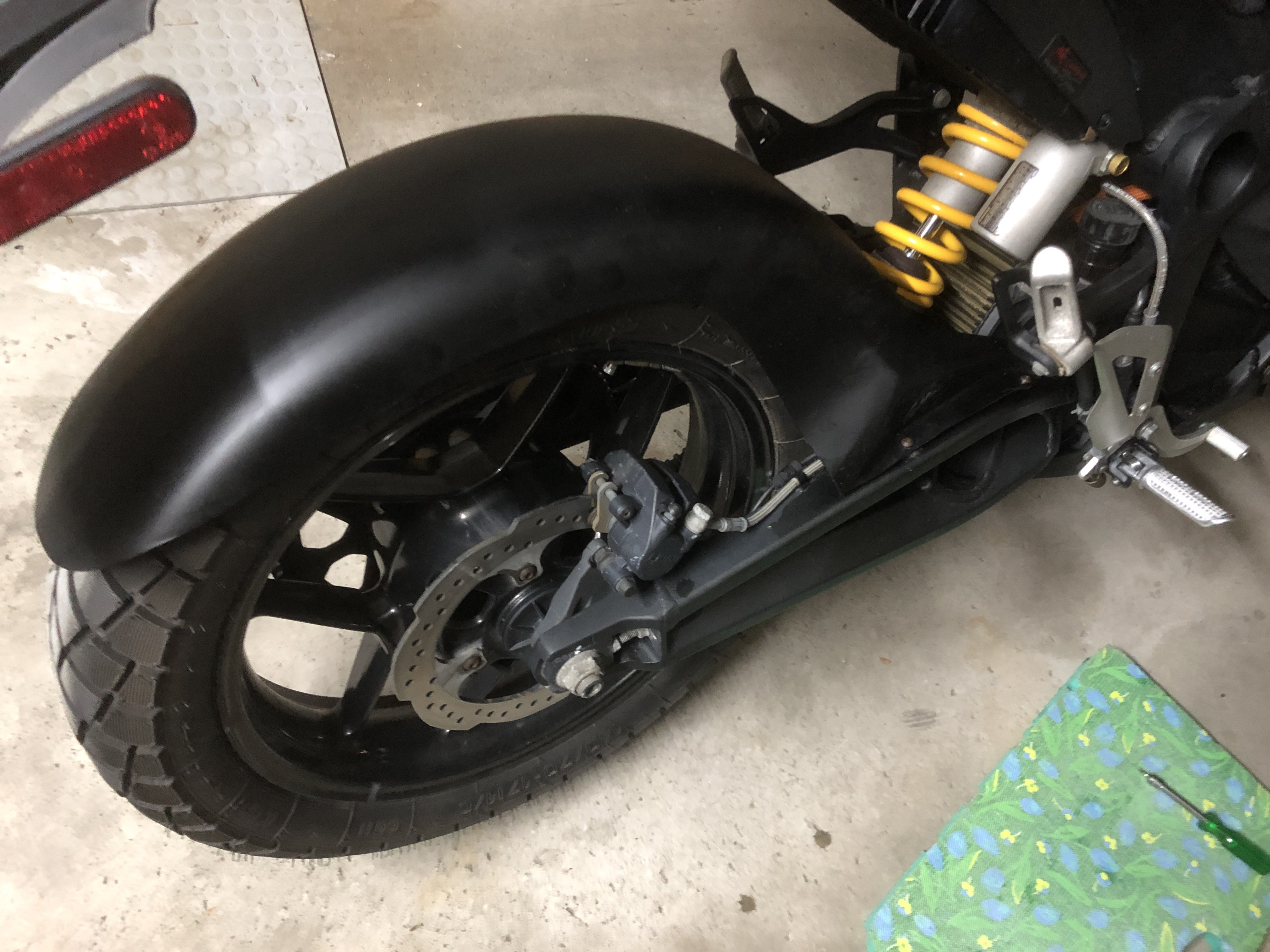 Da schon morgen, das ganze Wochenende und Montag auch schon Schietwetter angesagt ist musste heute Abend nach ein paar Stunden Lack trocknen der GFK-Ganzrad-Spritzschutz für hinten gleich ans Mopped. Doch leider haben die Belgier geschlampert...