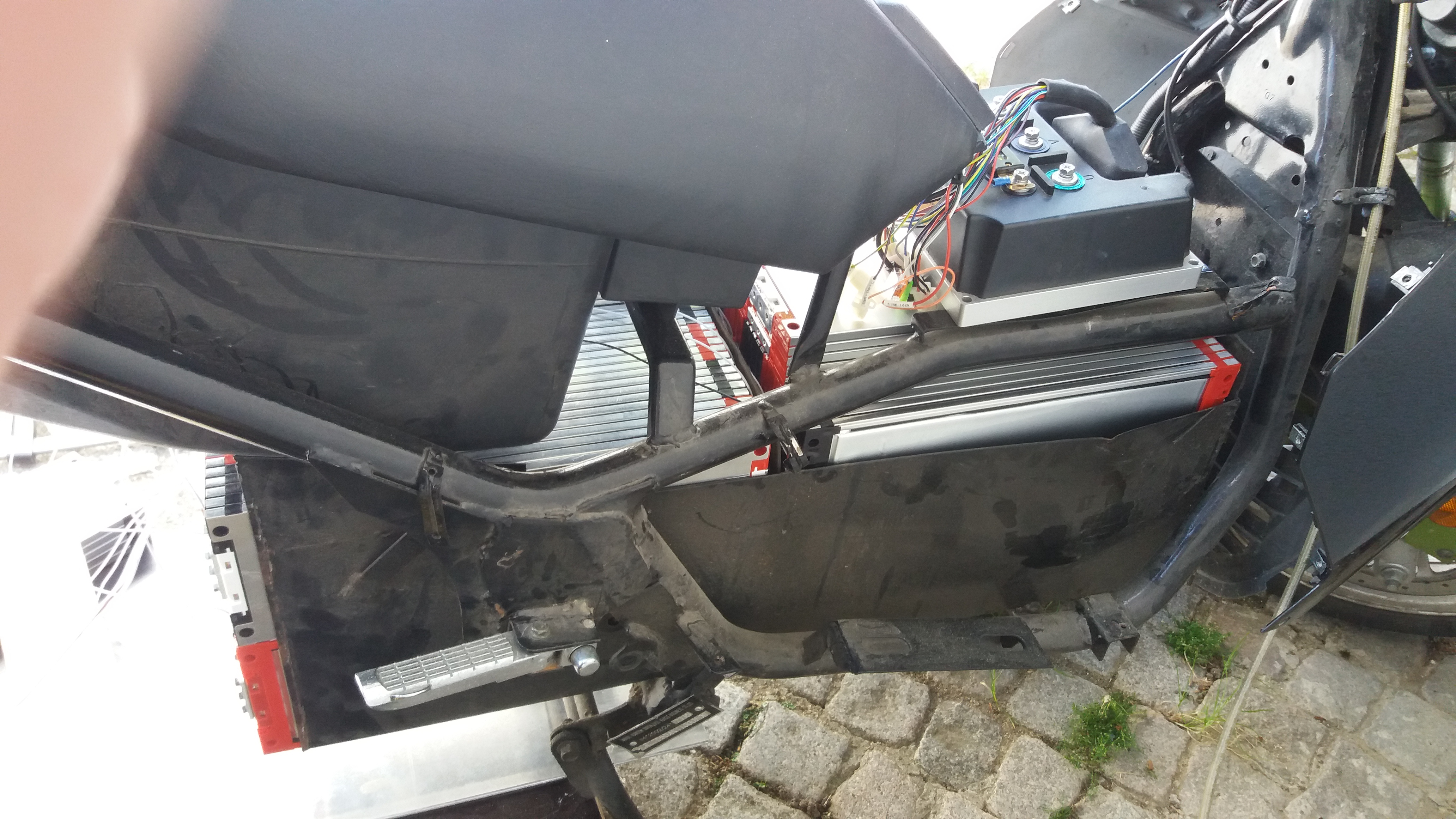 Ja, das ist derselbe Batteriekasten wie in meinem Thunder, mit den aufgeschweißten Zusatzblechen hinten, um bis zum Helmfach abzuschließen. Und den Verstärkungsstützen zu den seitlichen Rahmenrohren hoch.