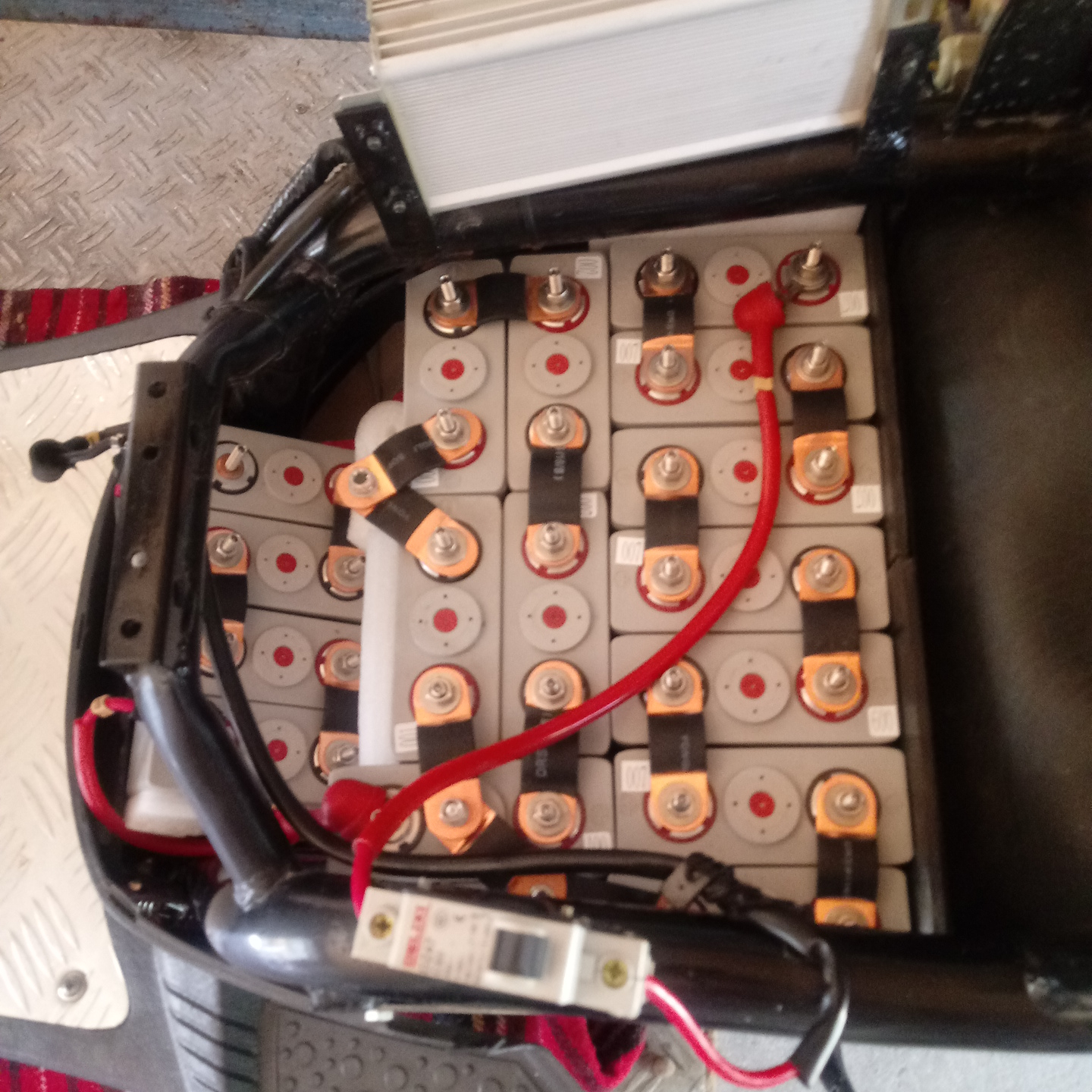 Erst einmal muß man 16 CALB Akkus im Roller unterbringen. Ein Platz fürs BMS sollte sich immer finden.