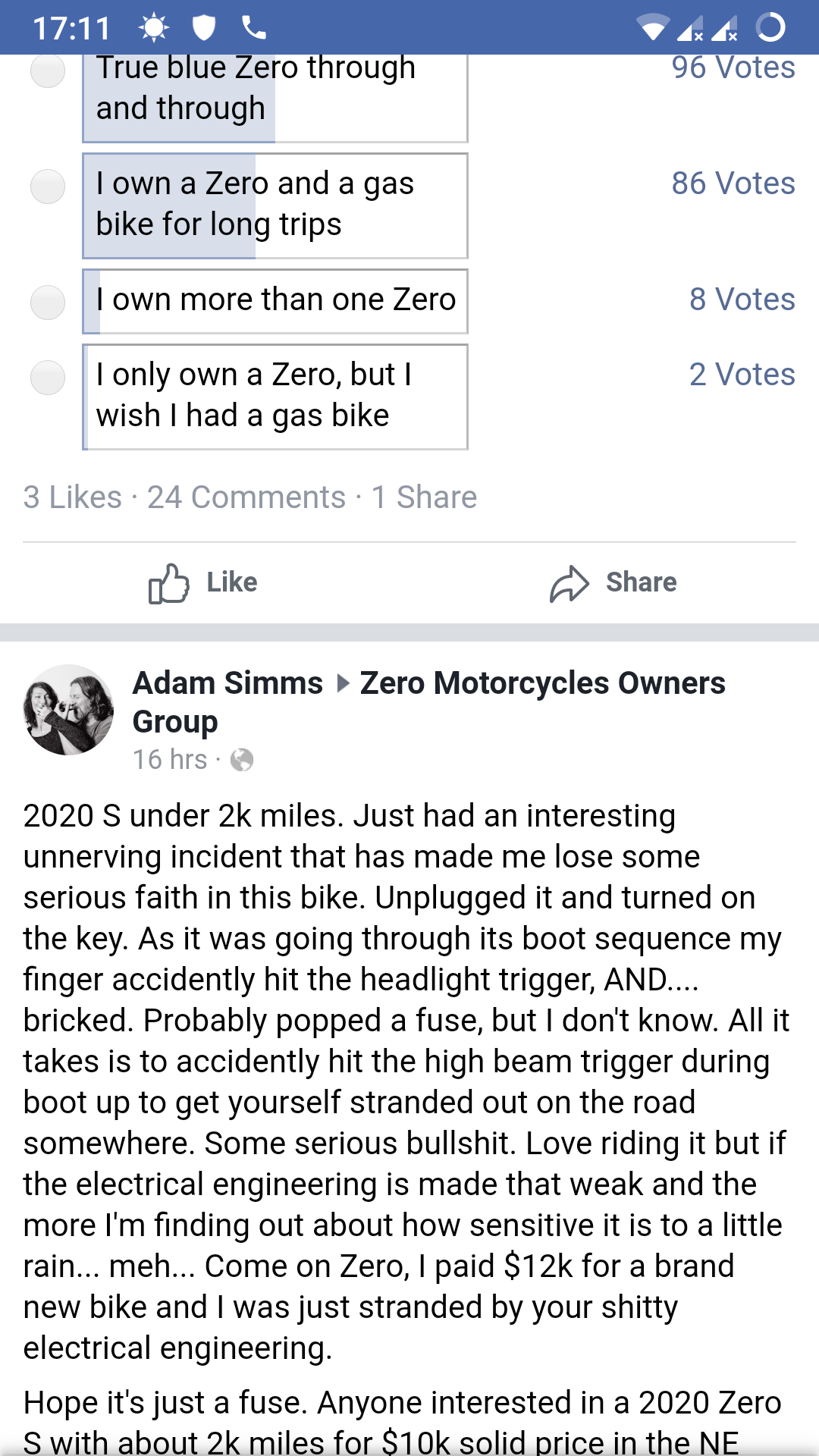 Na, da habe ich heute eine detaillierte Analyse zur Elektrik der Zero gefunden. Quelle: Zero Motorcycles Owners Group auf Facebook. Weil die Gruppe öffentlich ist, denke ich, dass ich den Screenshot hier herein stellen kann.