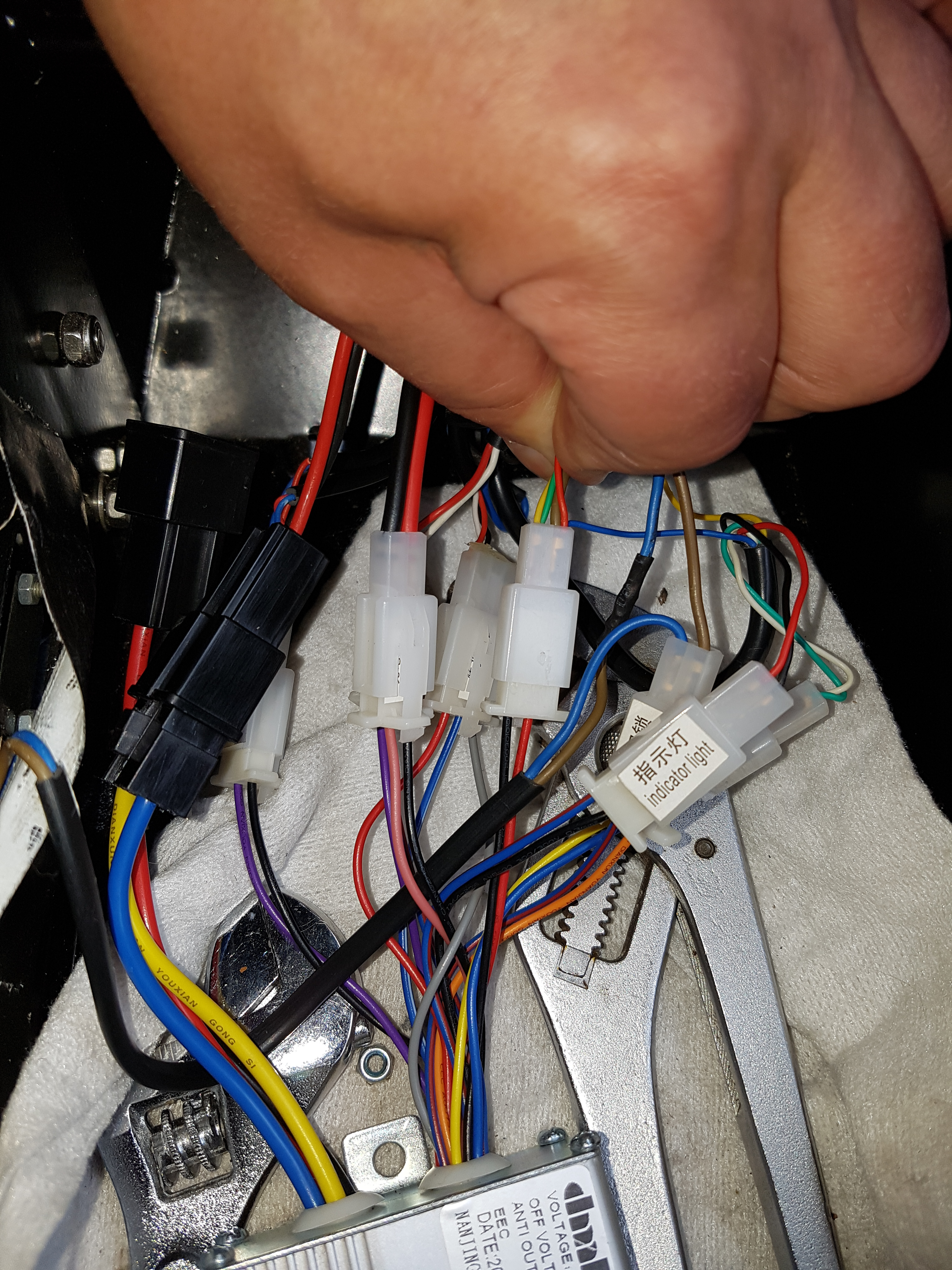 Nein Blinker hat er nicht. Den Kabelbaum werde ich noch markieren, erst Morgen mal wieder zusammen bauen. Heute macht das keinen Sinn. Ich muss in die beiden anderen Roller noch einen GPRS TRACKER einsetzen.