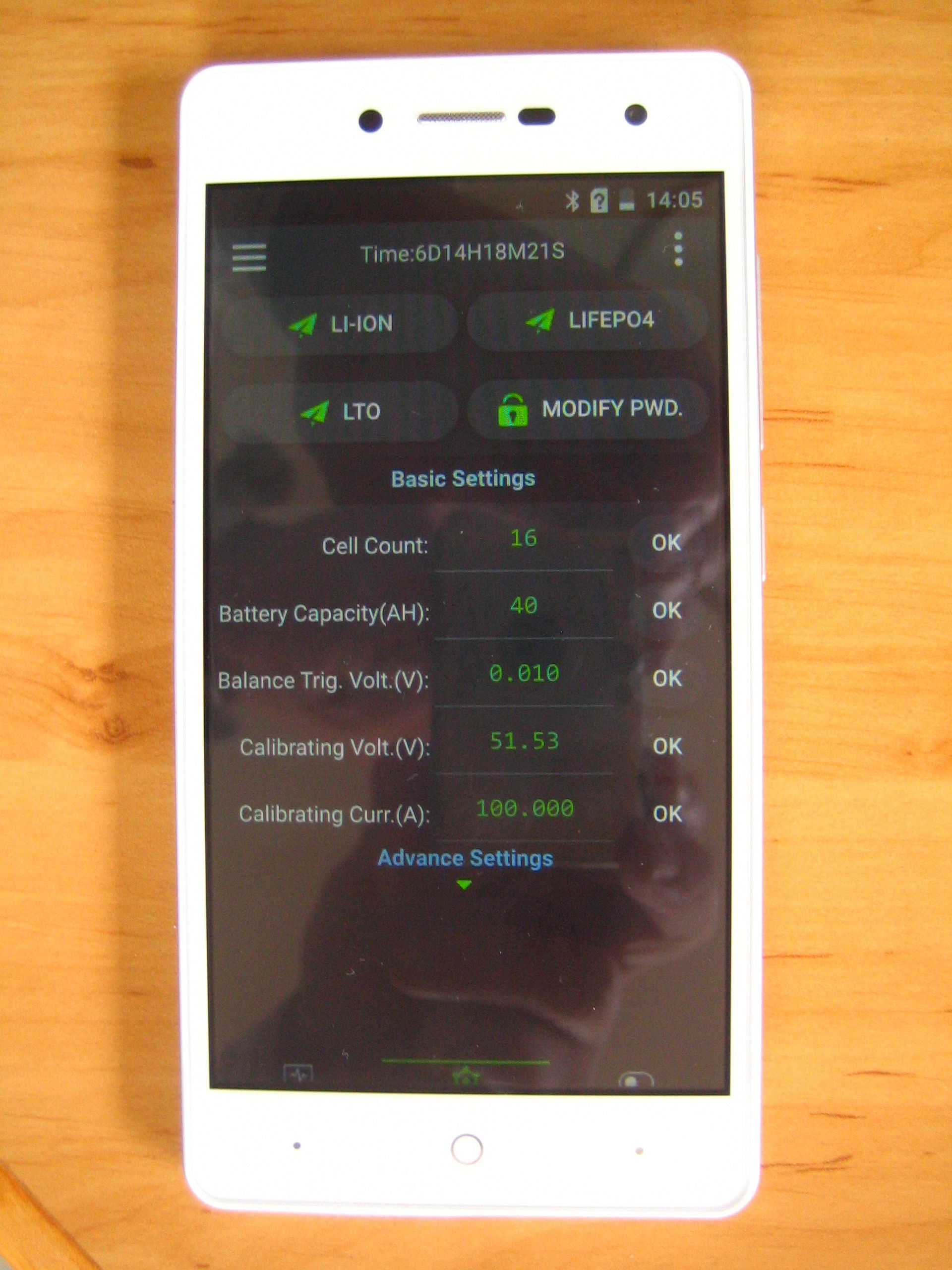 Mit Calibrating Volt kann man die gemessene Gesamtspannung vom guten Voltmeter eingeben. Plus 1,28V ergibt in der Anzeige plus 80mV pro Einzelzelle. Mit meiner Parametrierung bin ich eigentlich fertig. Das JK-BMS kommt demnächst in meinen 120er E-Max. Mit den Basic Settings werde ich auskommen: