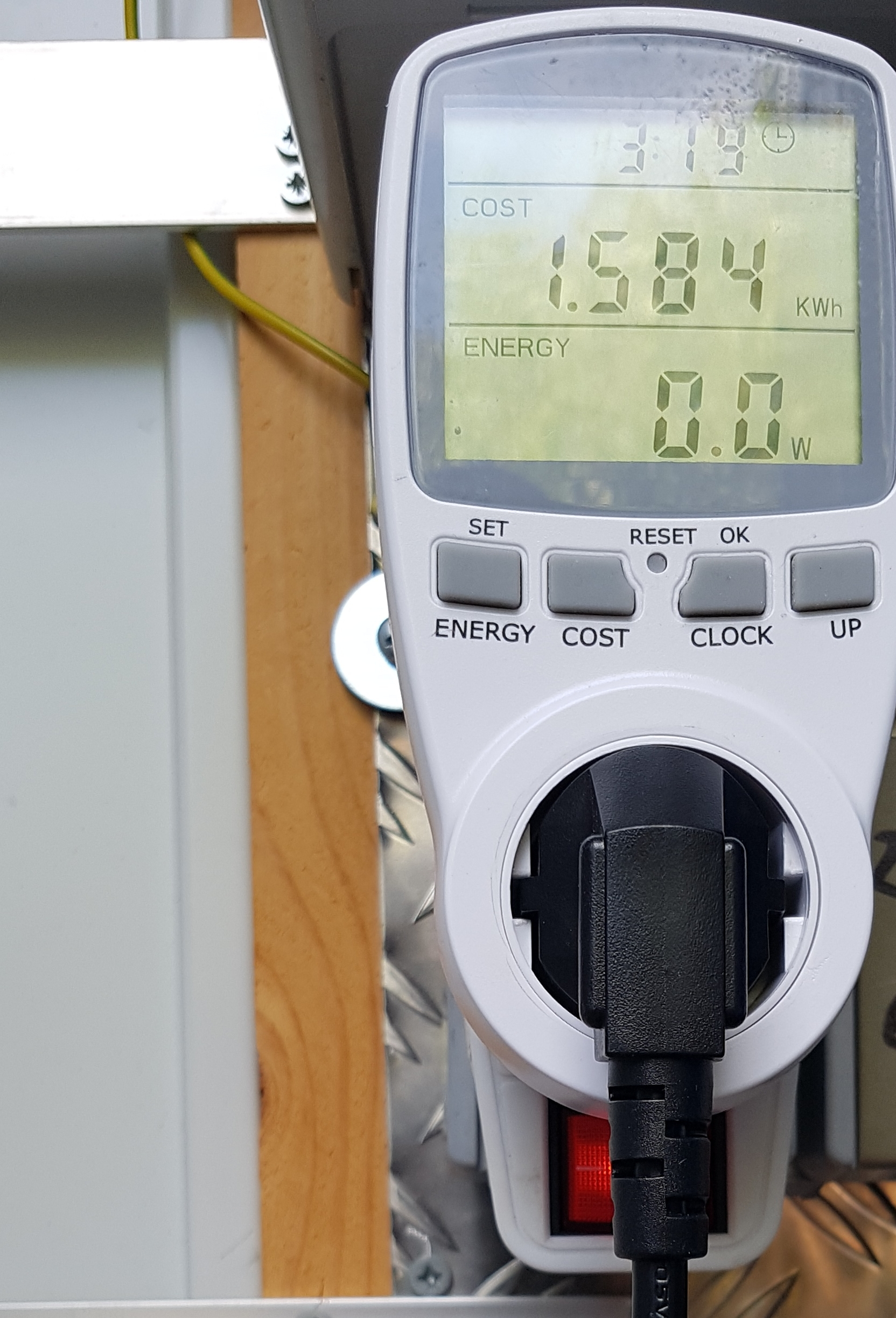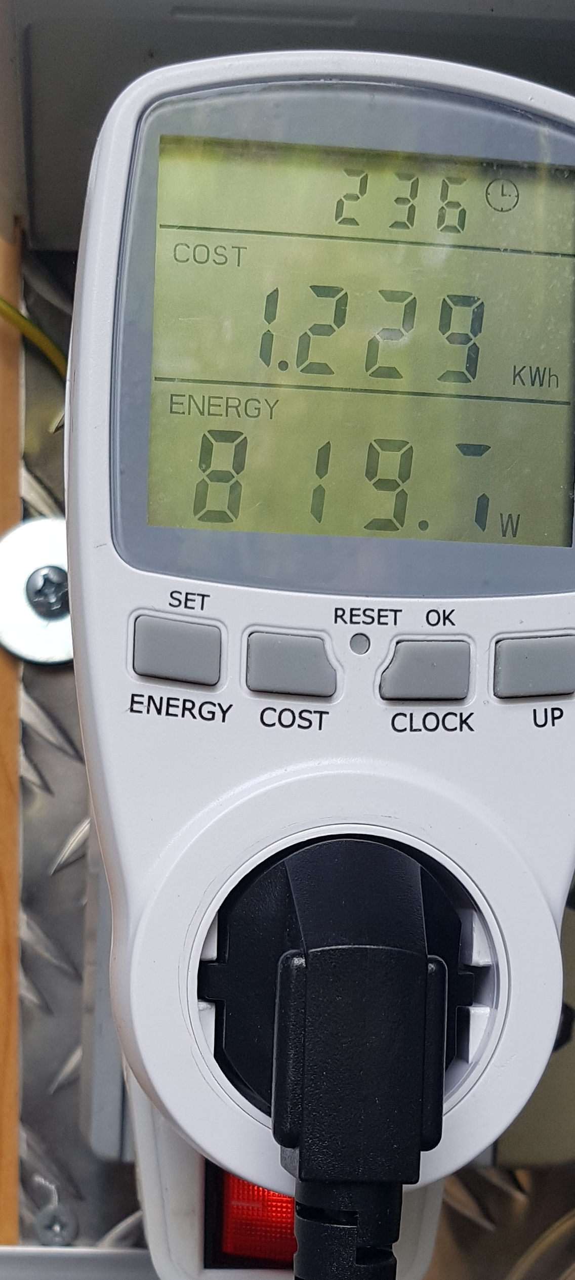 Start mit dem externen Lademodus mit zwei Akkus bei 24% und 828 Watt aus dem Schnelladegerät. Ende nach ca.4,5 std. und 100%. Höchste Stromentnahme aus 220 V = 961 Watt. Vor dem Ladeende geht das Ladegerät langsam mit der Wattzahl runter ( Beginn ca. 30 min vor dem Ladeschluss ). Also 100 km kosten bei 0,30€ pro KW Strom ca. 1,10€. Gesamt Verbrauch auf 104 km = 3.761 kW.