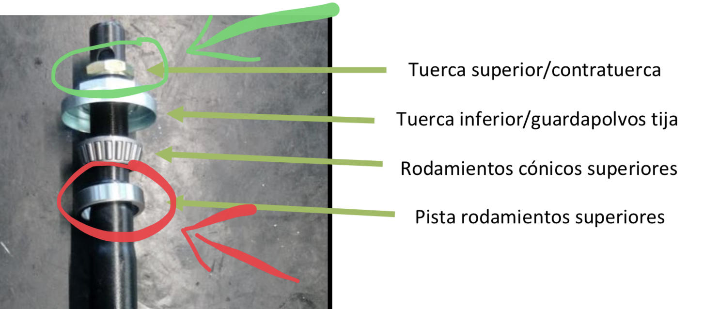 Ich zitiere Norbert: „ Ich denke es ist das "Pistas rodamientos superiores", die äussere Lagerschale des Lenkkopflagers. Die steckt im Rahmenrohr und ich denke da bewegt sie sich. Solche Lagerschalen sind einzeln nicht so stabil, die sind dafür gemacht irgendwo fest drin zu stecken und nicht da rumzuwandern. Es könnte auch die innere Schale sein, die auf dem Lenkrohr klappert.“