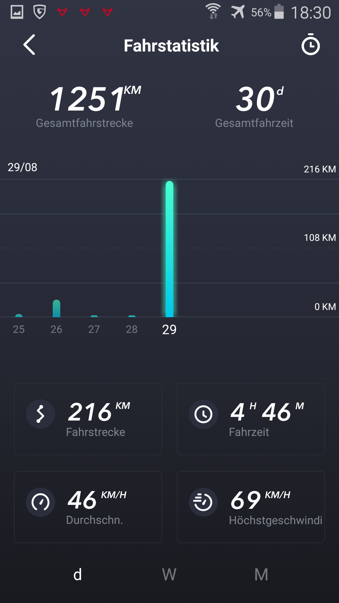 Gesamtverbrauch: 155%, 216km Gesamtstrecke , 4,46h Gesamtfahrzeit und 69km/h Höchstgeschwindigkeit.