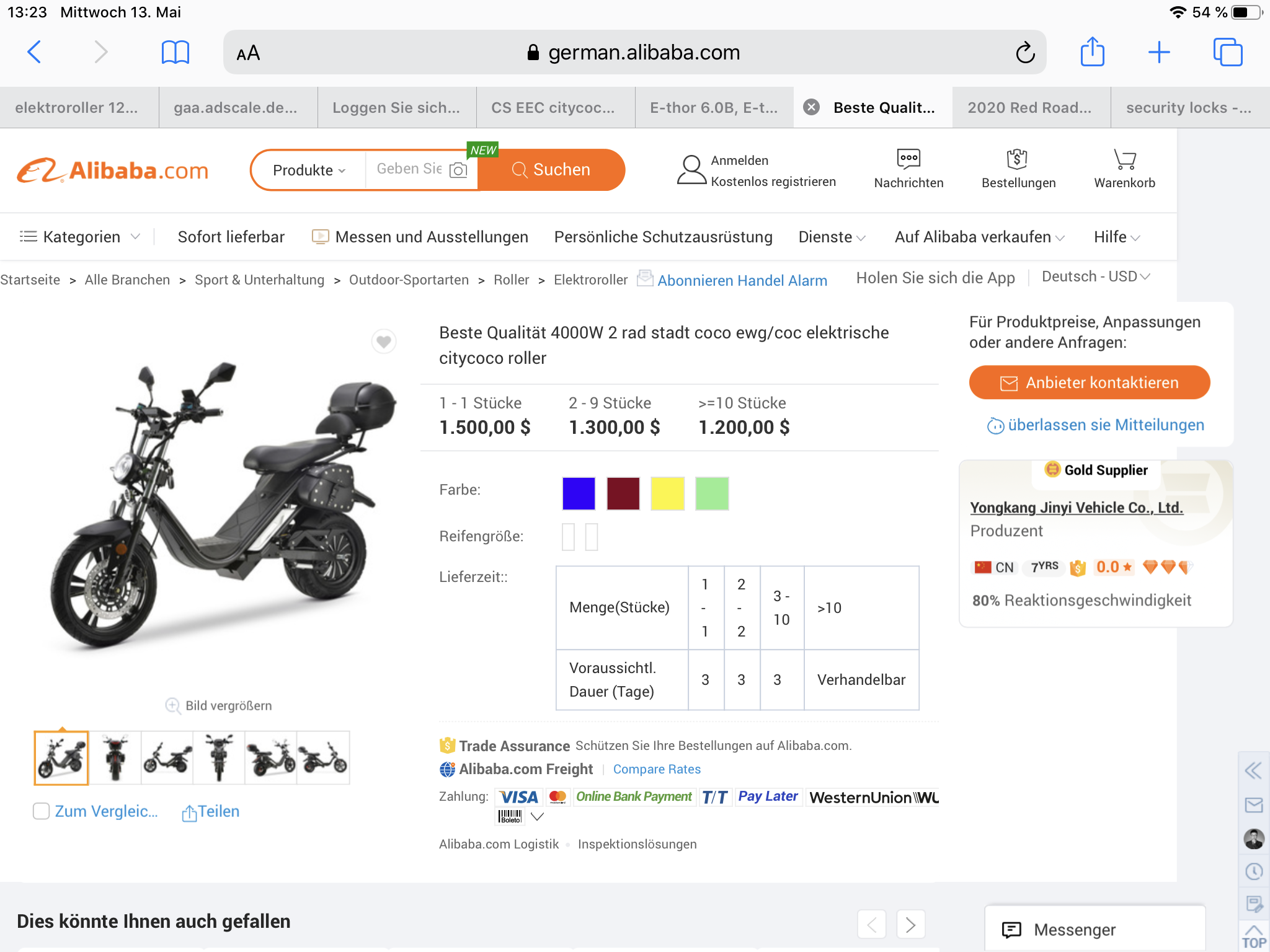 Mich würde der E-THOR 6.0b interessieren. Er besitzt einen 4000 Watt MOTOR, einen 38Ah Akku, vorne einen 17 Zoll, hinten einen 13 Zoll Reifen. Bei Alibaba kann man ihn ab zwei Stück bestellen. Vielleicht sollte man sich zusammen tun und 2 oder mehr bestellen!? Hat jemand Erfahrungen mit solchen Käufen aus China? Sie sollen (Angeblich) zollfrei geliefert werden?