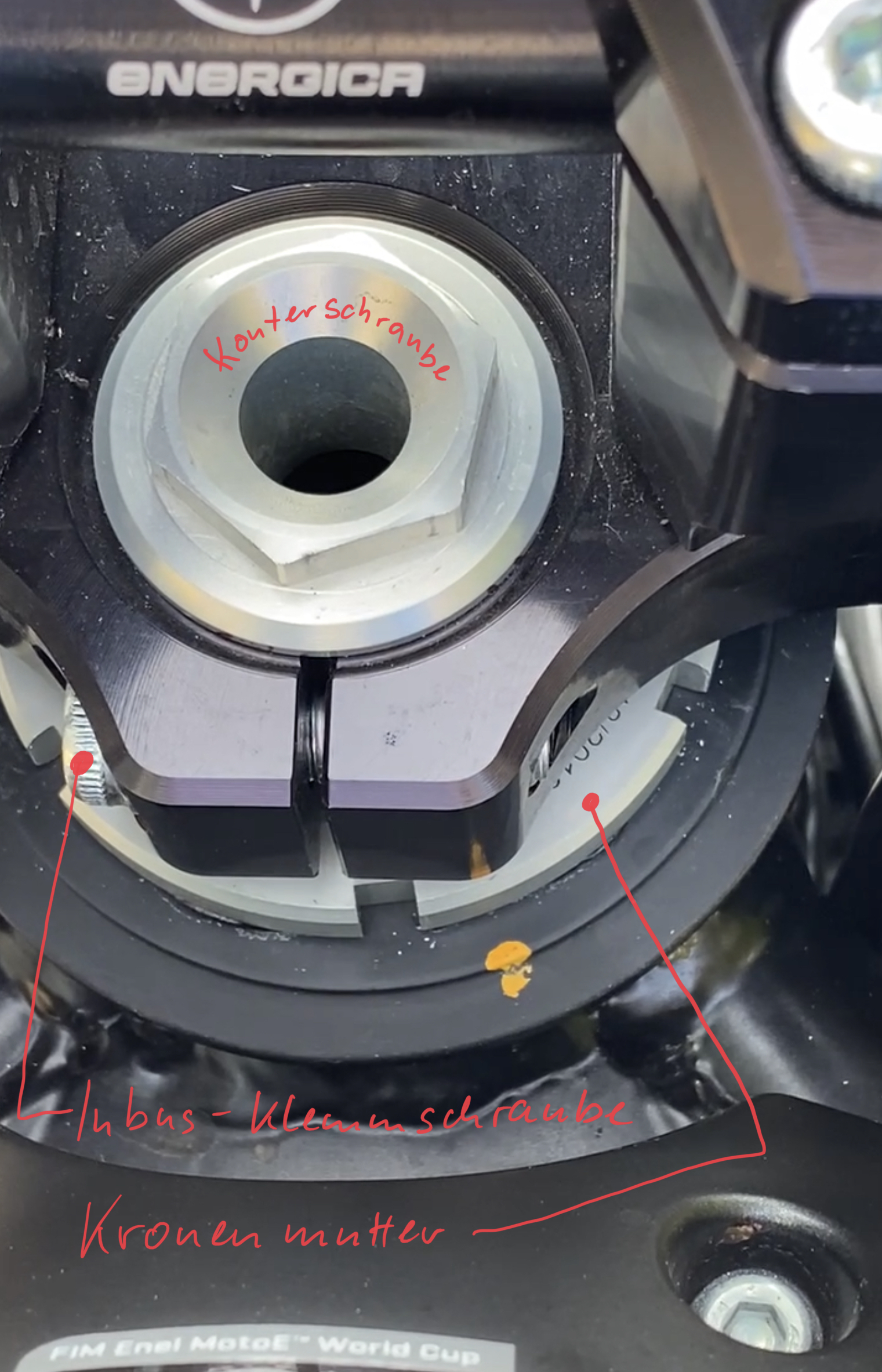 2. Durch das Ergebnis ermutigt, habe ich mich dann selbst ans Lenkkopflager gewagt. Es muss der Lenker runter (vier Schrauben, Klemmbrücke des Lenkers), dann kommt man an die so schon gut sichtbare SW24mm-Konter-Schraube ran. Die ist aus Alu und ist mit reichlich Kupferpaste in den Lenkkopf bei sehr geringem Drehmoment (geschätzt 20-30Nm) eingesetzt. Danach die drei 6mm Inbusschrauben an der oberen Gabelbrücke gelöst. Ich hatte noch aus GS-Zeiten einen Hakenschlüssel für ein WP-Federbein, da musste ich lediglich die Hakenbreite etwas reduzieren, dann passte er satt in die Kronenmutter des oberen Lagers (sieht man ja auch gut). Habe die Mutter 1/8 Umdrehung aufgedreht, alles wieder festgezogen (erst Konter-Schraube mit 30Nm, dann Klemmschrauben mit 25Nm). Die Kronenmutter hat eine Farbmarkierung, die ist immer noch sichtbar (nur jetzt auf etwa 4Uhr) - d.h. die muss ich im Auge behalten...