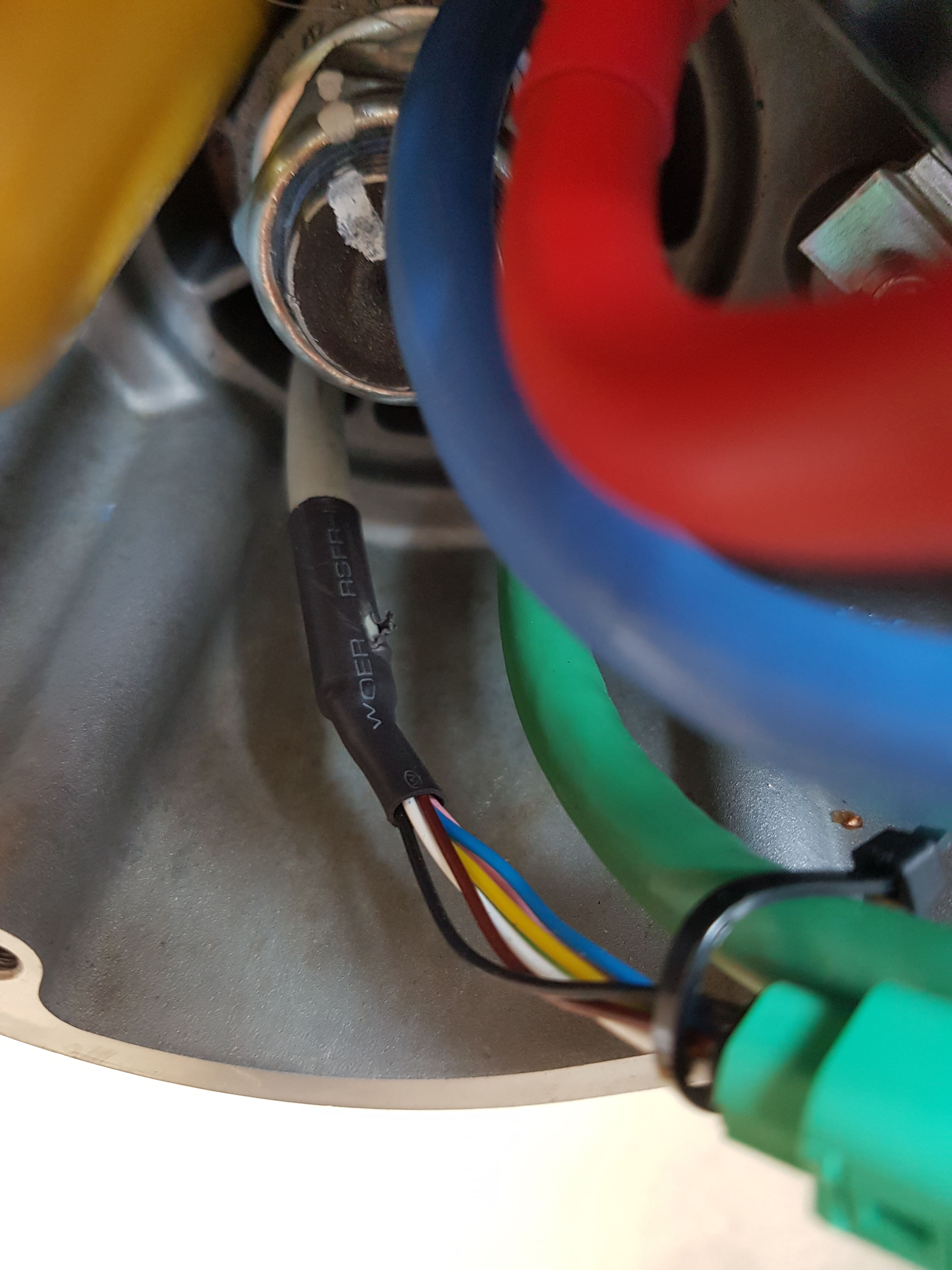 2 Adern sind sehr sicher der Temp.-sensor, und 4 Adern der Drehzahlsensor. Aus der Verkabelung, die man von den Bildern als wahrscheinlichste ableiten kann, schließe ich, dass es wahrscheinlich ein analoger sin-cos-Encoder ist. Aber was ist die 7. Ader? Da muß ich wohl nochmal aufschrauben...