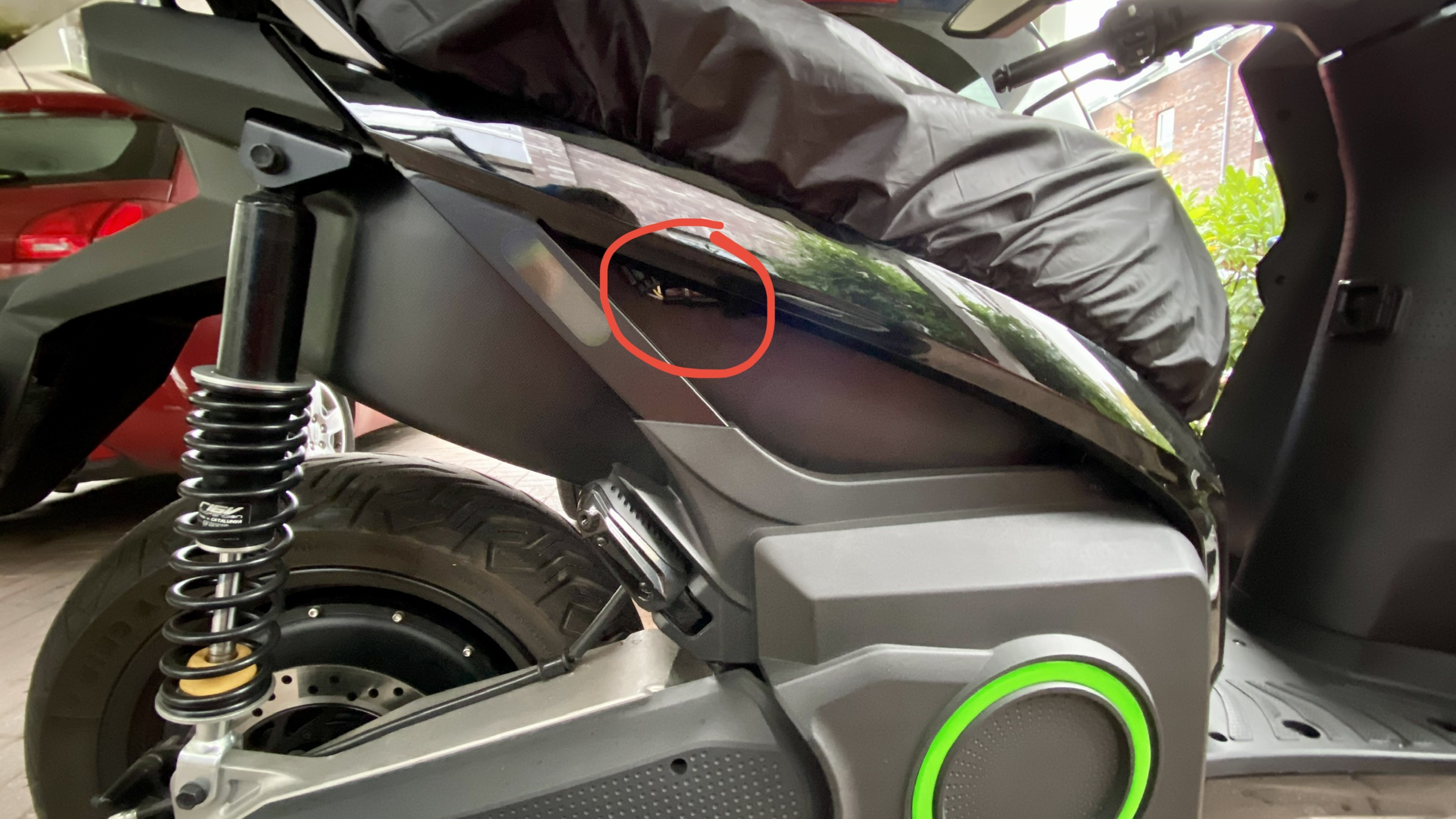 Das Kabel beim Sitz ist das 230V-Kabel von der Ladebuchse unter dem Sitz zum Akku runter. So gesehen ist das beim Fahren nicht in "Betrieb", aber ich hoffe mal schwer, dass die Steckverbindung dicht ist, sonst fliegt da beim Anstecken ganz schnell mal der FI.