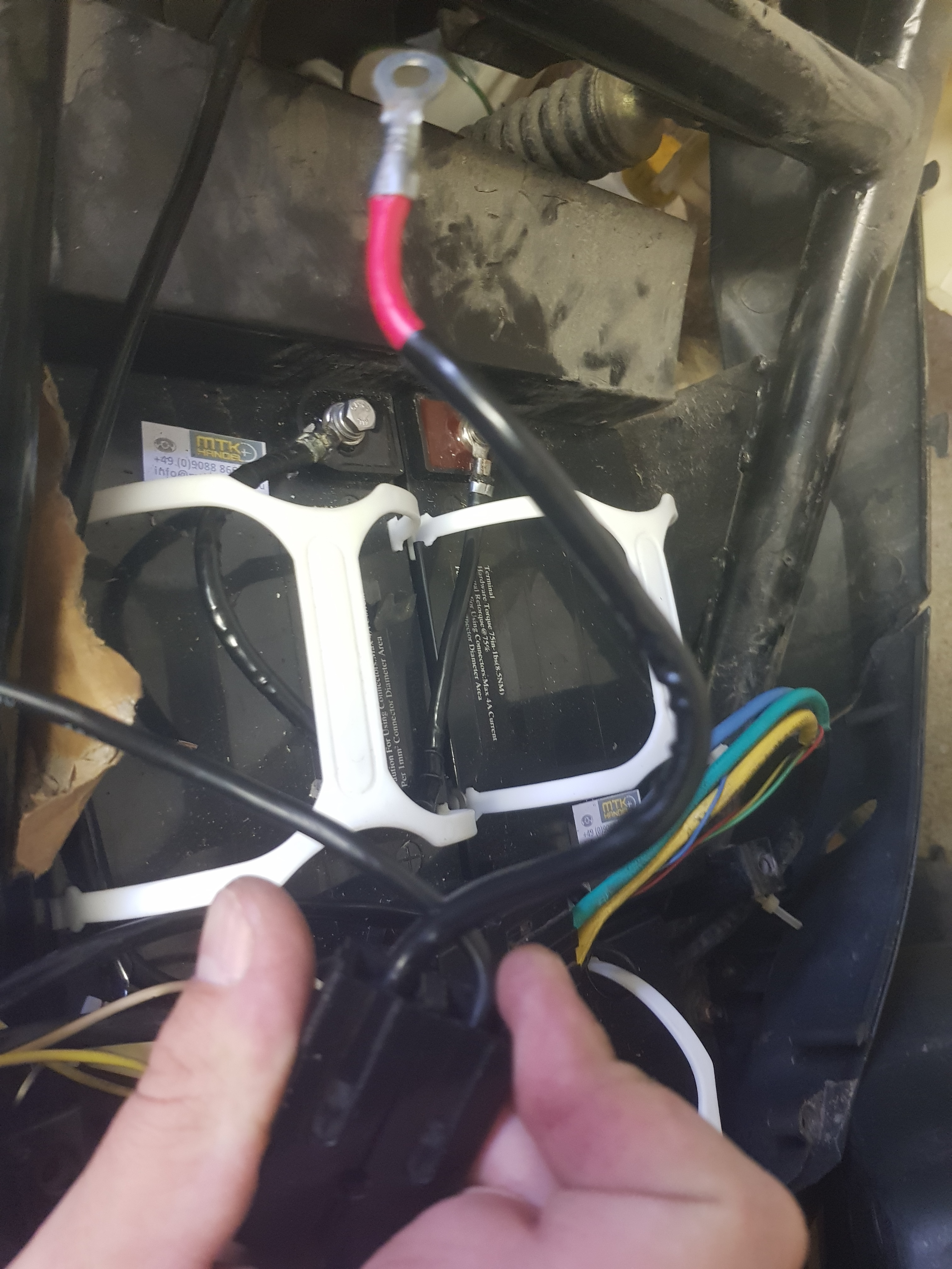 Auf der Roller-Seite rechts (in Fahrtrichtung) geht der Kabelstrang zum Controller: Da sind warscheinlich alle Kabel in Steckverbindungen geführt die deim Batterietausch eventuell rausgeruscht sind. Die würde ich jetzt prüfen.
