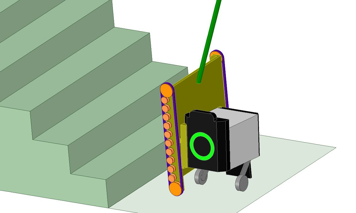 Die Länge ist so bemessen, daß die Raupe immer auf mindestens zwei Stufenkanten liegt. Kippeln wird das aber trotzdem. Da müsste man den Akku auf der Platform anheben. Eher nicht realistisch.