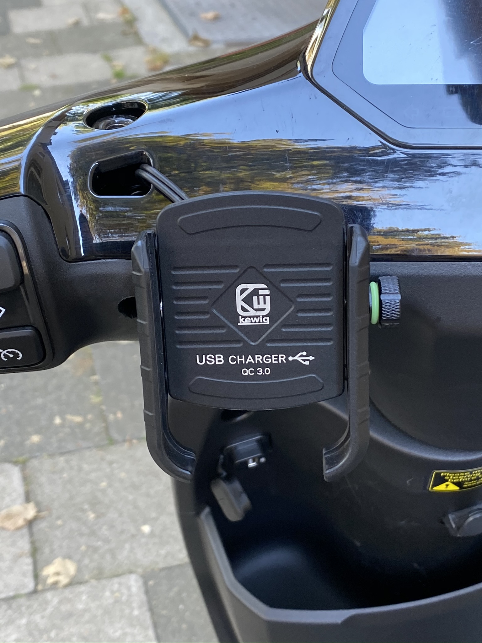 der untere Teil der Halterung welcher als Klemmschelle um ein Lenkerrohr passt lässt sich vom Hauptteil abschrauben. Man muss ein kleines (4mm) Loch in die Verkleidung des Rollers bohren. Durch dieses habe ich den Handyhalter dann festgeschraubt. Es ist die schwarze Kreuz-Schraube auf dem zweiten Bild. Zudem wurde zwischen Verkleidung und Handyhalterung ein kleines Stück Spiegel-Montageband geklebt. Wahrscheinlich keine ideale, für mich aber eine ausreichend gute Lösung.
