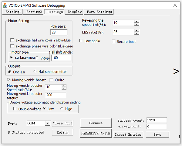 Votol EM-150/2 - completely new controller Stand heute, die Software läuft, der R232/USB Treiber ist auf COM4. Die Parameter & Port Settings werden noch interessant werden.