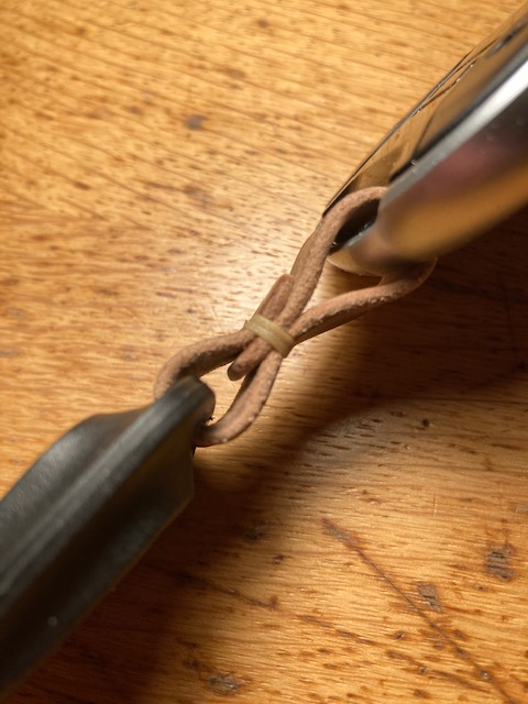 In diesem Fall also mittels Leder-Doppel-"Schlaufe". Das könnte man auch nieten, aber ich wollte das so kompakt/kurz haben wie möglich. Die Niete hätte ca. 10mm Länge beansprucht, sinnlos, ungut.