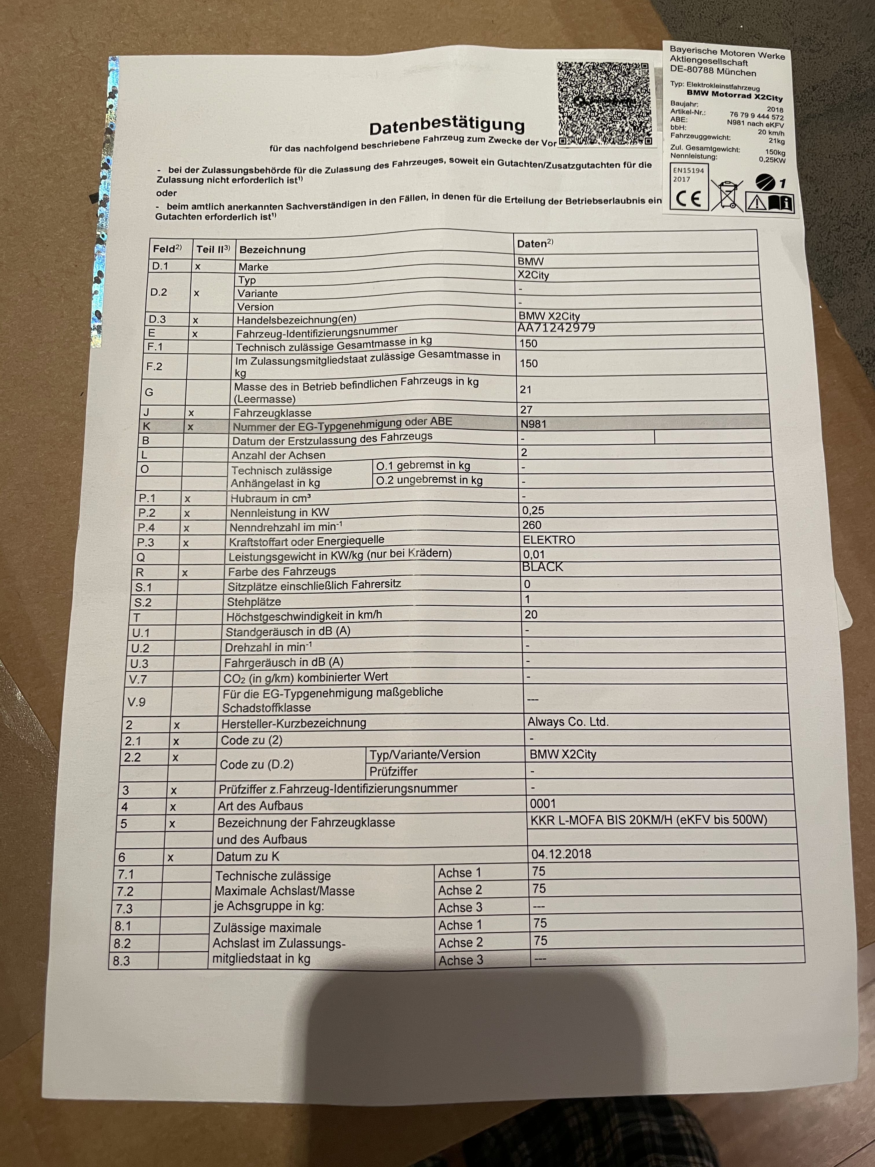 Wie Evo schon schrieb, dieser Scooter kam auf den Markt, bevor die E-Kleinstfahrzeuge Verordnung durch war. Es saß quasi zwischen allen Stühlen. Deshalb vielleicht auch die absolut unübliche Zulassungsbescheinigung Teil II...