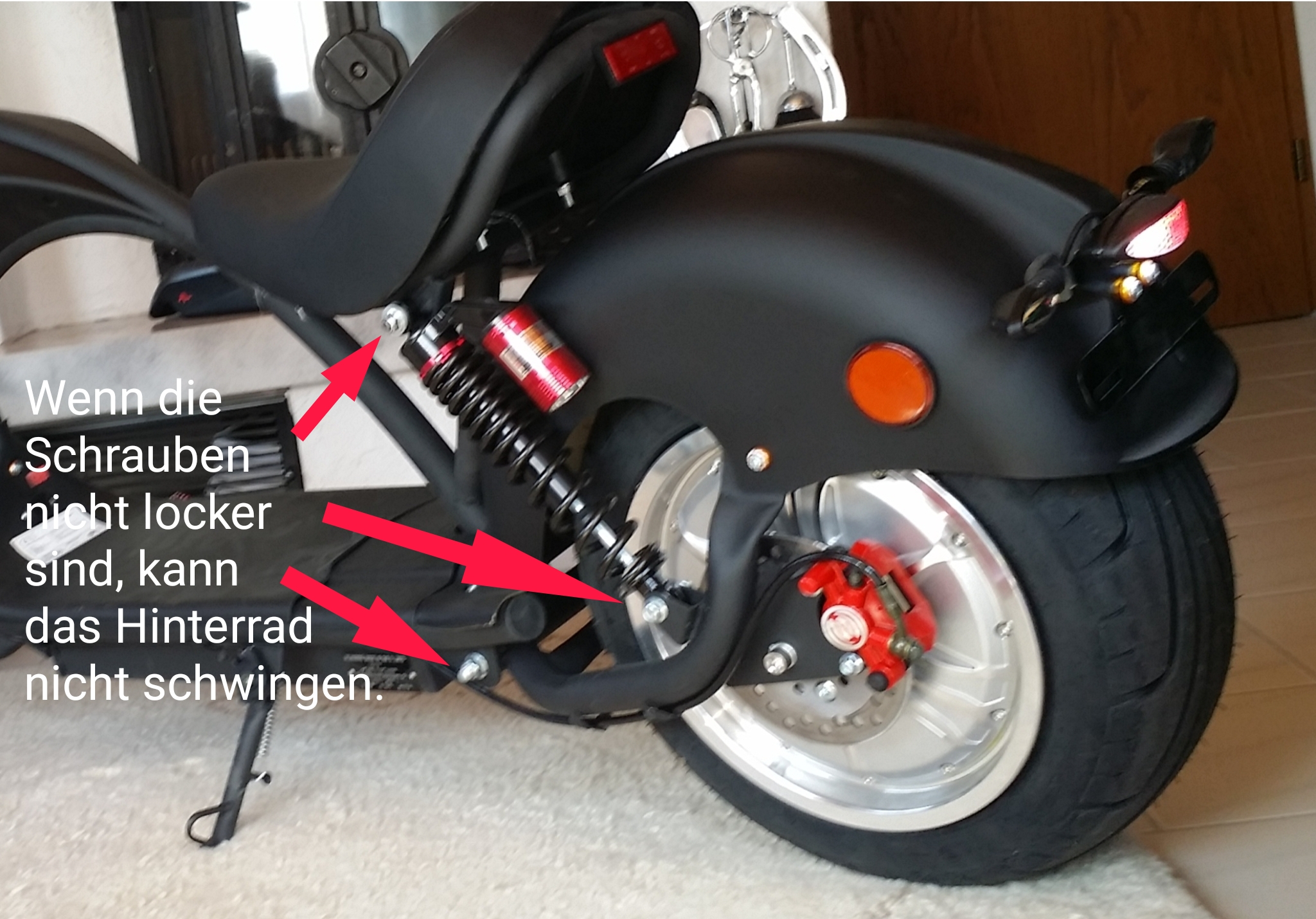 Die Quietschen der Hinterradbremse ist normal und hat nichts mit einem Schlag zu tun! Die Bremse ist schwimmend gelagert und muss sich auch in axialer Richtung bewegen dürfen. Was hier frequenziell angeregt wird ist der Bremsklotz. Das kann man beheben, indem man diesen an der Vorderkante etwas anfast. Das regelt sich aber nach 100-300km von selber! Ich selber hatte jetzt gerade eine lose Hinterradbremse, die sich radial bewegt hatte. Lösung hier: Einmal zu Govecs gedüst und die haben mir im Rahmen einer kleinen Inspektion die Achse wieder festgezogen.