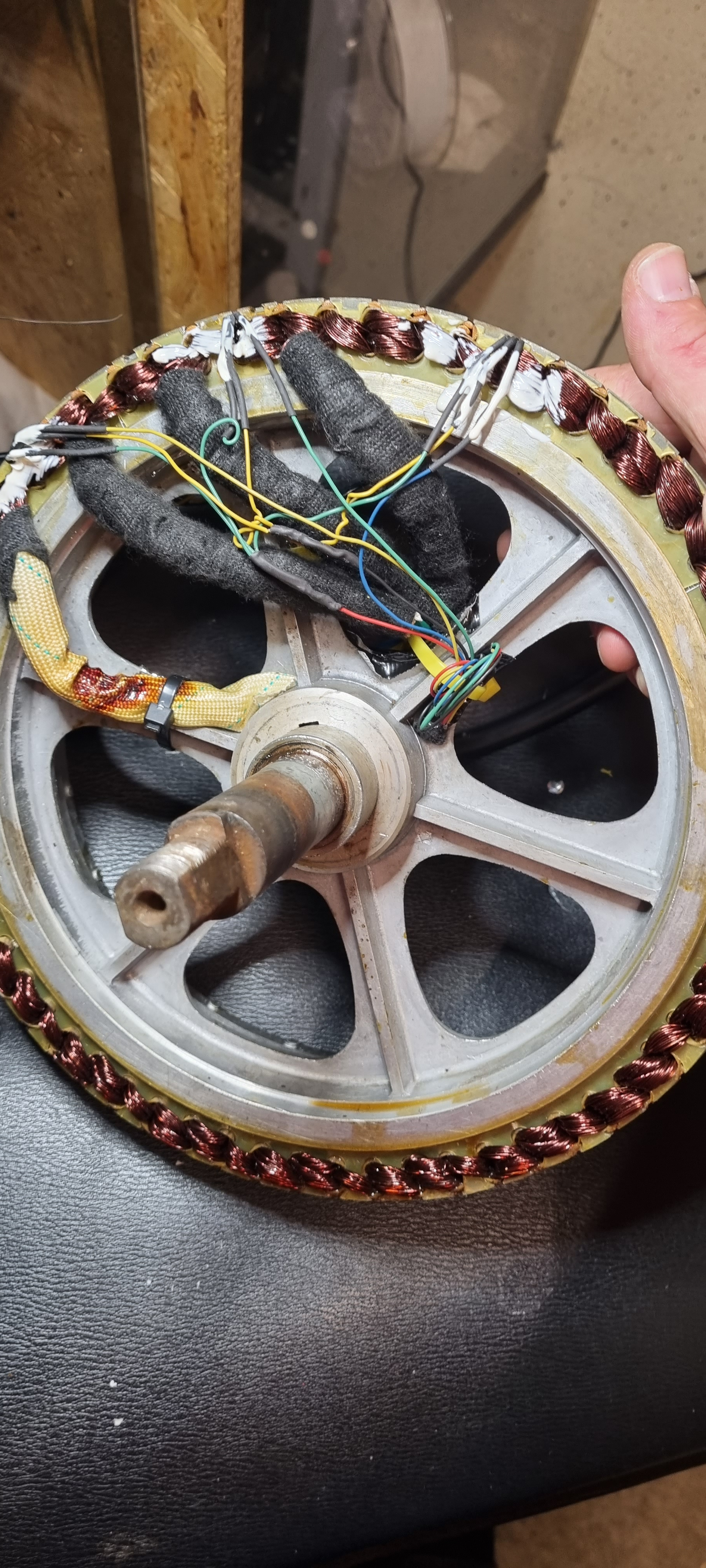 So, der erste Motor hat neue kabel bekommen. Fehlt noch der schutzlack am frisch poliertem Alu-Grhäuse und wasserfeste stecker für den hallsensor. Der Temperatur Sensor wird leider nicht verbaut da das fertige kabel mit isolierung durch die öffnung der Welle perfekt gepasst hat. Auch die reserve Hallsensor Kabeln werden nicht angeschlossen da das Kabel lediglich 5x0.3 drähte besitzt.