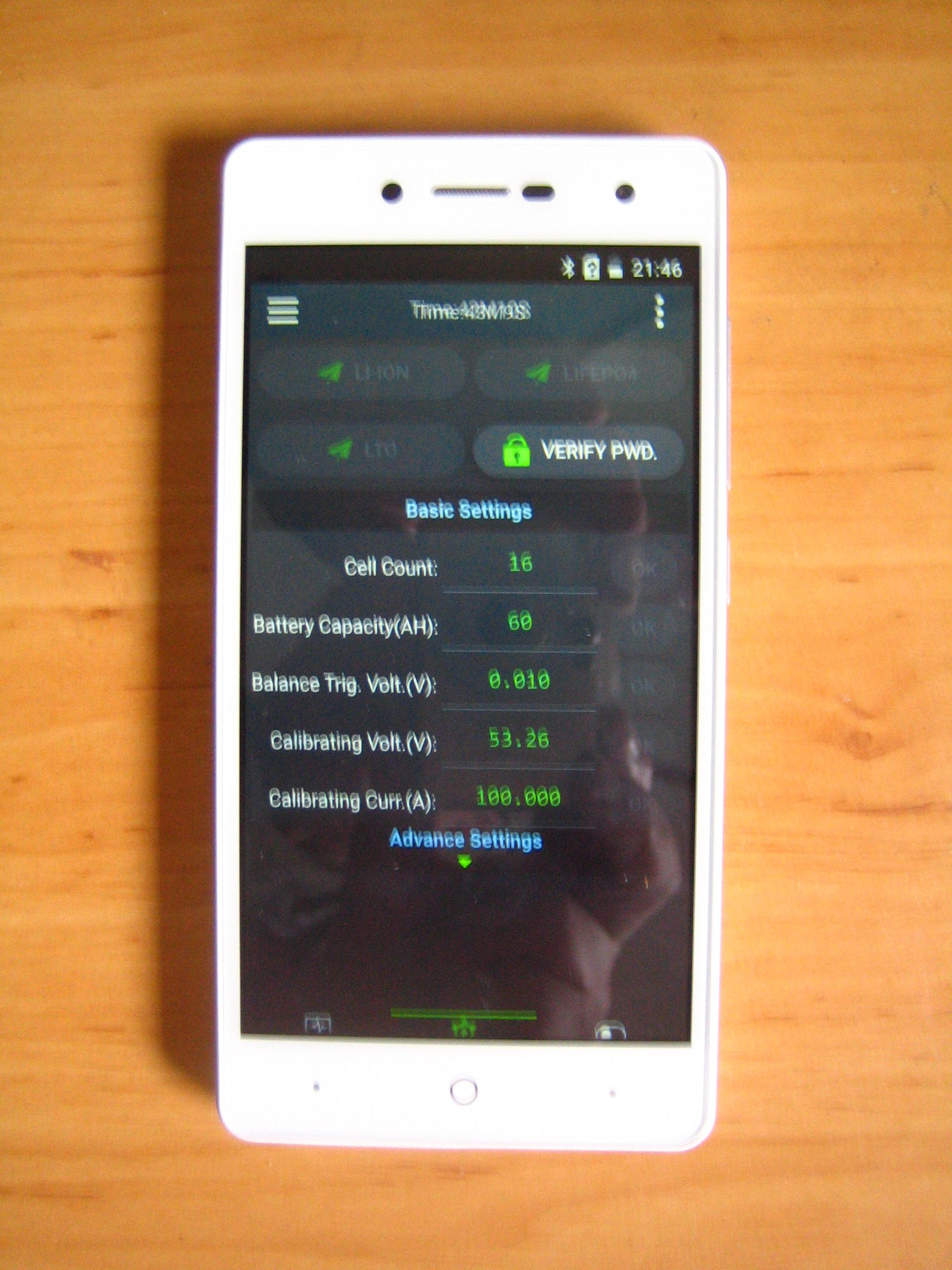 Der QR Code für die App ist auf dem Gehäuse. Nach Eingabe des password kann man LiFePo4 anwählen sowie die Zellenanzahl eingeben. Dann ist man mit der Basiseinstellung schon durch - meine 75Ah Zellen sind hier noch nicht eingestellt.