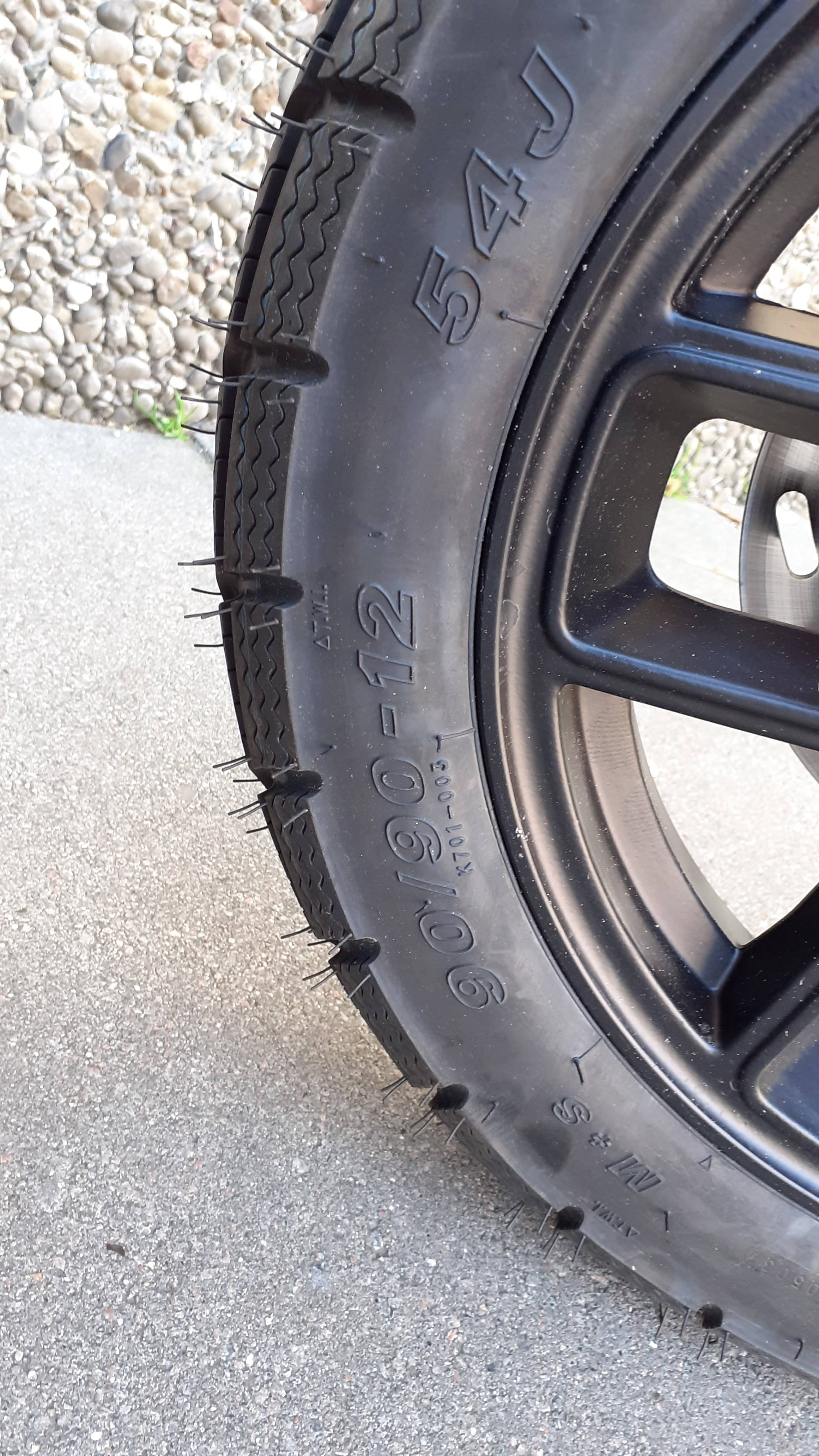 In der Tat sind vorne und hinten der gleiche Kenda 90/90 12 - 54J aufgezogen.