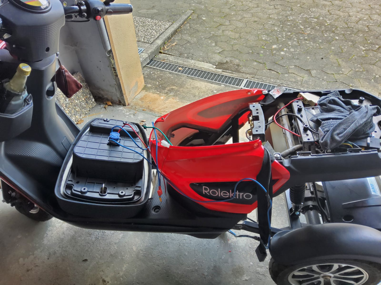 Ich fing also an zu basteln. Zuerst kamen die Blei Akkus raus und ich habe den Lithium-Akku an ihre Stelle gesetzt. Es passte, obwohl der Händler mir gesagt hatte, dass das nicht geht. Bei der Probefahrt, jetzt 46 Kilo leichter, hat es mich beinahe nach hinten runtergehauen, so ging der auf einmal los. Damit erstmal zufrieden, montierte ich noch ein 48l Topcase auf den riesigen Gepäckträger und schraubte den "Hundekorb" vorne ab.