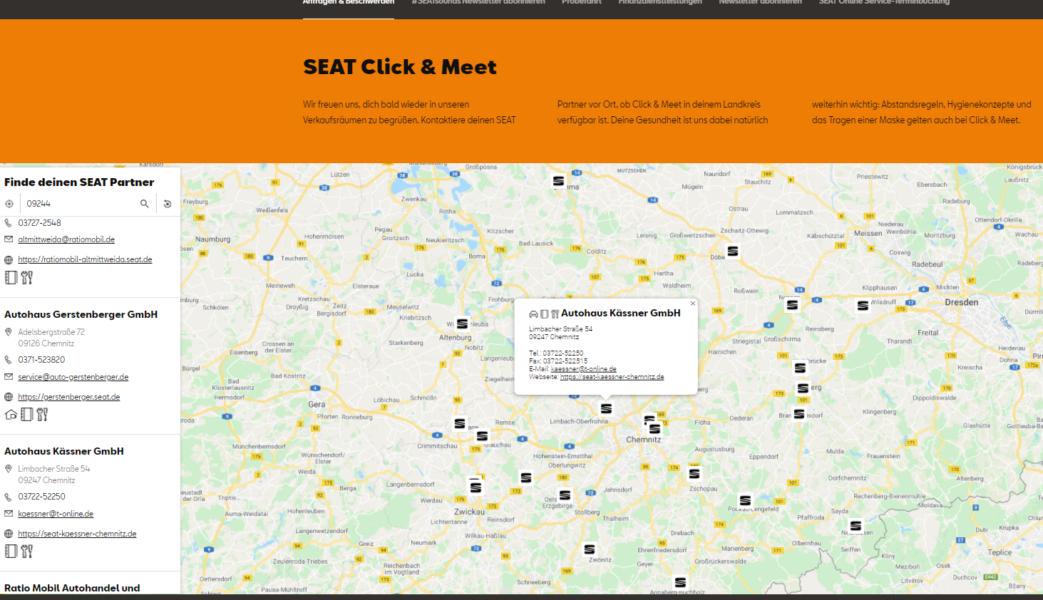 Wenn ich "Seat MO Händler" anwähle, bekomme ich lediglich 7 Händler im Raum Frankfurt angezeigt. Definitiv kein 04552 Borna.