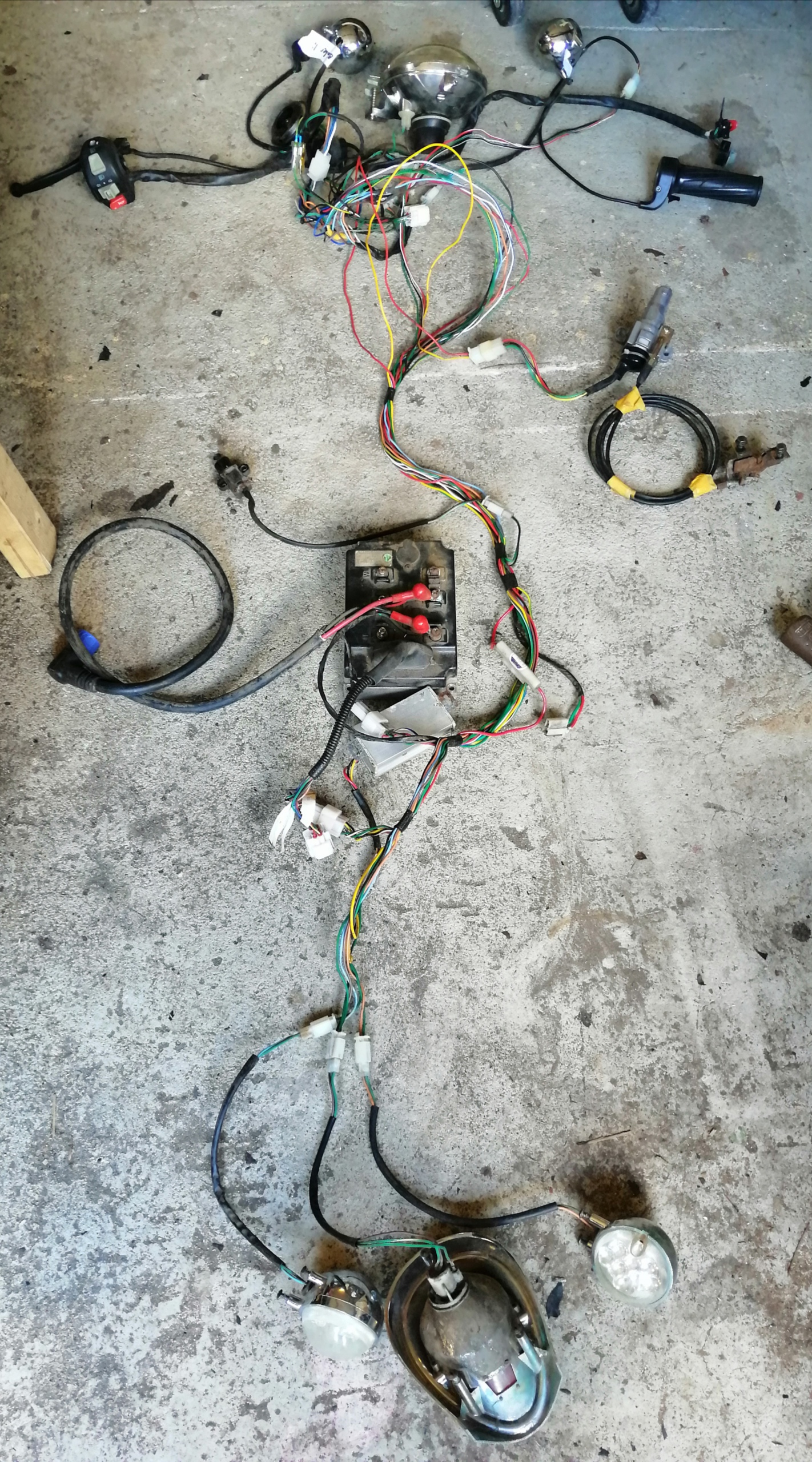 Als nächstes habe ich mal den gesamten Kabelbaum des Unu neben die Vespa gelegt. An sich würde das so klappen. Nur wird das "Nadelöhr" die vielen Kabel durch den Lenkkopf zu bekommen. Daher möchte ich da ein wenig das Kabelgeraffel ausdünnen.