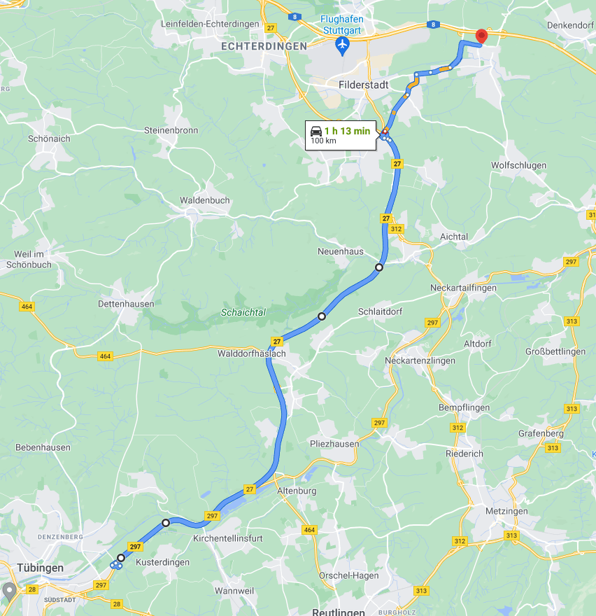 Heute bin ich 100km weit gefahren, mit noch 2km Restreichweite daheim angekommen. Nur die ersten und letzten paar km über Land und durch Ortschaften gefahren, ansonsten mit durchgehend 100 echten km/h, beim LKW Überholen auch mal kurz 110km/h B27 zwischen Bonlanden und direkt vor Tübingen, je zweimal und hin und zurück: