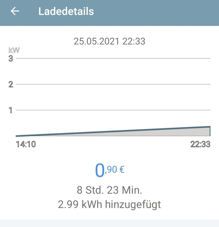 laut Florians Angaben sind dann, nach Abzug von ca. 10% Ladeverlusten, etwa 4kWh Energie in den Akku gegangen. Das sind nur etwa 70% der 5,6kWh Maximalkapazität des Akkus.