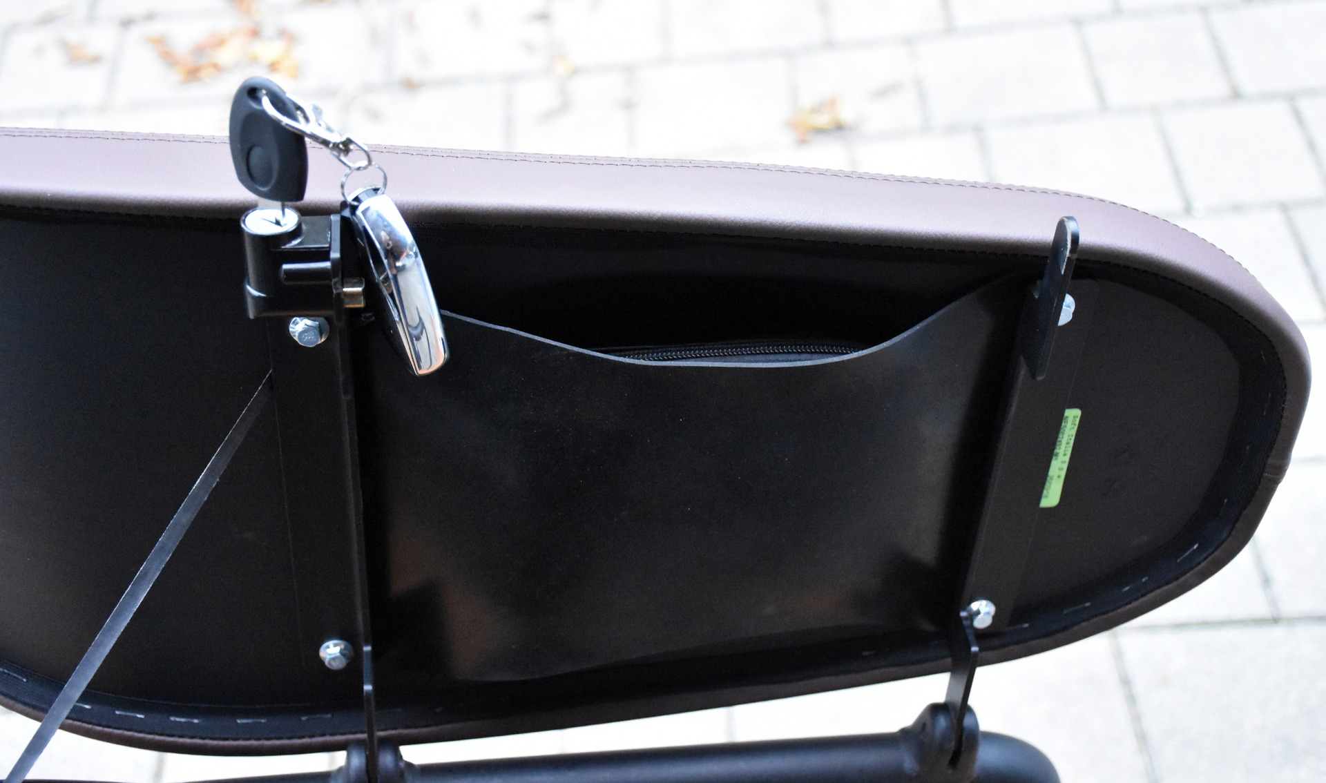 Die Box unter den Sitz ist recht geräumig, jedoch passt ein Helm eher nicht rein. Links und rechts vom Sitz können Satteltaschen oder ähnliches recht gut an den Rohren befestigt werden.