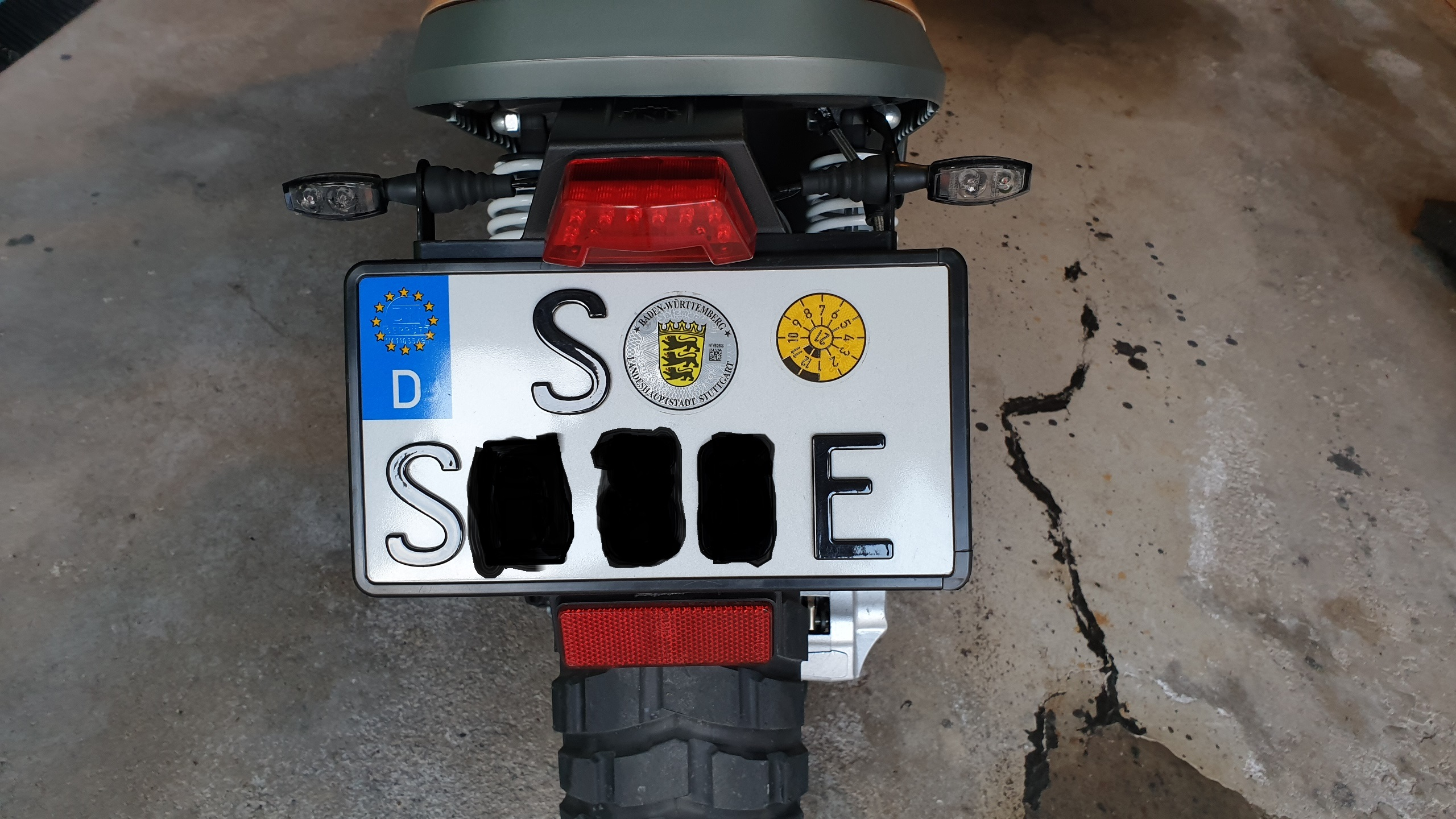Weil ich den Kennzeichenhalter des NES für die schmalen Leichtkraftkennzeichen in D für zu lange halte, habe ich das Kennzeichen direkt oben unter das Rücklicht montiert, den unten überstehenden Teil des Halters gekürzt und damit den unteren Rückstrahler hoch gesetzt.