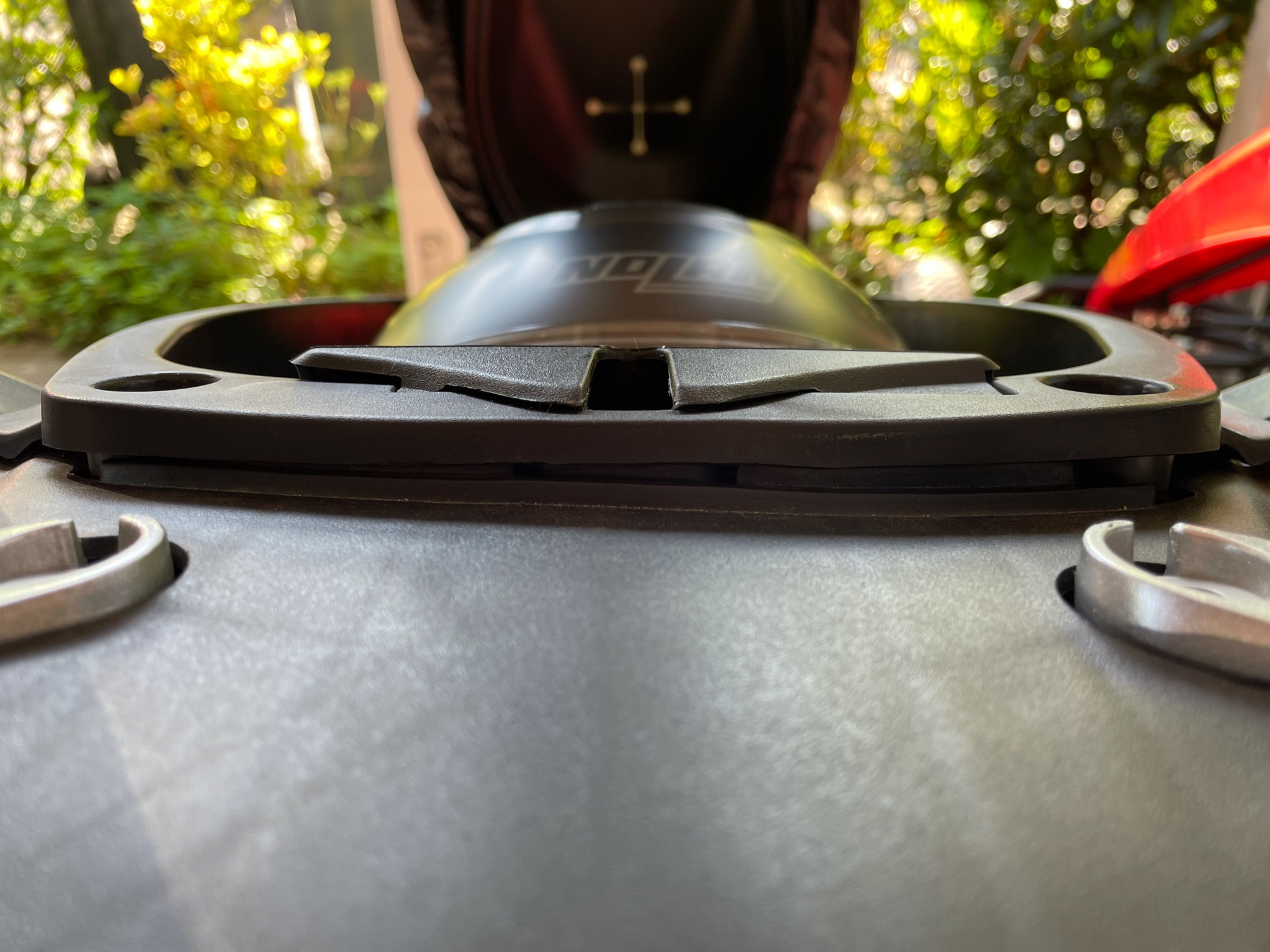 Tante Edit fragt, ob es vielleicht damit zusammen hängt, dass die Sitzfläche zum Verschließen schon kräftig runtergedrückt werden muss, wenn ein großer Helm im Staufach ist. Der dann natürlich gegen die Sitzbank presst und vielleicht so auf Dauer dieses schiefe Teil mit herausdrückt?