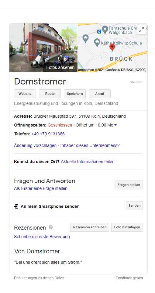 Die beiden Akteure haben nachdem das Ladenlokal vom Schlotmann GmbH Nachfolger Brt bereadyto nextmobility GmbH mittlerweile wieder geschlossen wurde schon wieder ein neues Unternehmen gegründet. Man hat sich in die ehemaligen Räume von Zweirad Brieger, Brücker Mauspfad 597, Köln einquartiert. Dort firmiert man jetzt unter dem Namen Domstromer, www.domstromer.de. Natürlich bietet man online auch wieder Fahrzeuge von Lieferanten an die nachweislich die Zusammenarbeit beendet haben, bzw. die beiden nicht beliefern, oder niemals beliefert haben. Ich habe vor ein paar Tagen einen Ausflug nach Köln gemacht um mir dieses mit eigenen Augen anzusehen, da im Impressum von Domstromer kein Name eines Geschäftsführers genannt wird (wahrscheinlich damit die neuen Machenschaften von den zahlreichen Geschädigten nicht sofort wieder entdeckt werden). Von weitem habe ich die altbekannten Akteure im Ladenlokal sehen können. Es ist unglaublich, die beiden machen vom Geld der Geschädigten ein Laden nach dem anderen auf. Soweit mir bekannt ist wurden insgesamt mindestens 8 Anzeigen wegen Betrugs in Sachen Schlotmann GmbH erstattet. Ein Gespräch habe ich allerdings vermieden, da die Gespräche in der Vergangenheit wegen den ganzen Lügen und dem Blödsinn den man von sich gegeben hat mehr als Sinnfrei waren.