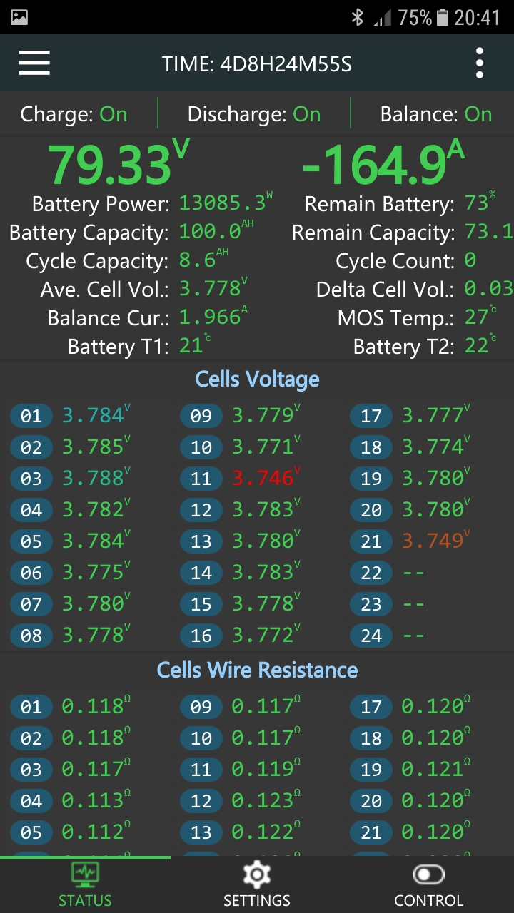 Statt 8 Stunden 6A (48AH) werden halt nur 8 Stunden mit 4,9A (39,2AH) gezählt. Bin gespannt ob das BMS bei einer fixen Zellspanung auf 100% SOC umstellt oder ob am Schluss bei 87V nur 90% SOC angezeigt wird.