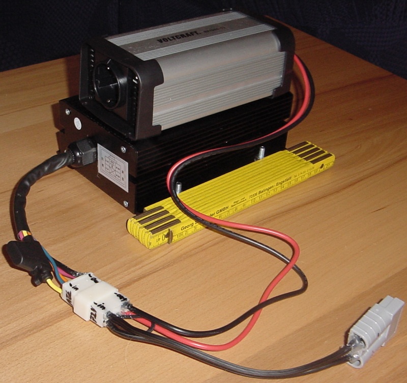 Unten ist der fette Kelly 72V-13,5V 400W DC-DC-Wandler. Oben drauf steht der "Voltcraft" (Conrad) NPI 300-12 300W Wechselrichter / Inverter. Beides kommt aus China.