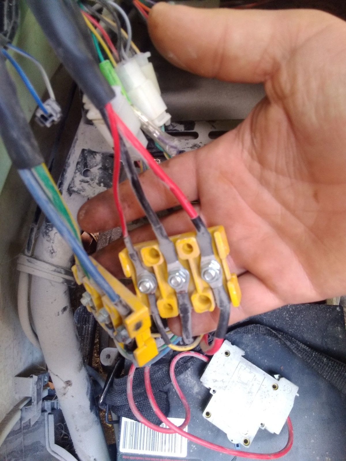Erkennen kann ich die zwei gelben dreifach-Verbinder. Da sind einmal dick Gelb Blau Grün die Motorpohasenleitungen die Du vermutlich schon richtig verkabelt hast. Im Anderen sind dick Schwarz un dick Rot die Versorgungsleitungen in den Controller. Die dritte dünne Leitung mit Öse ist so glaube ich rot. Das könnte die Einschaltspannung sein, aber wer weiß?.