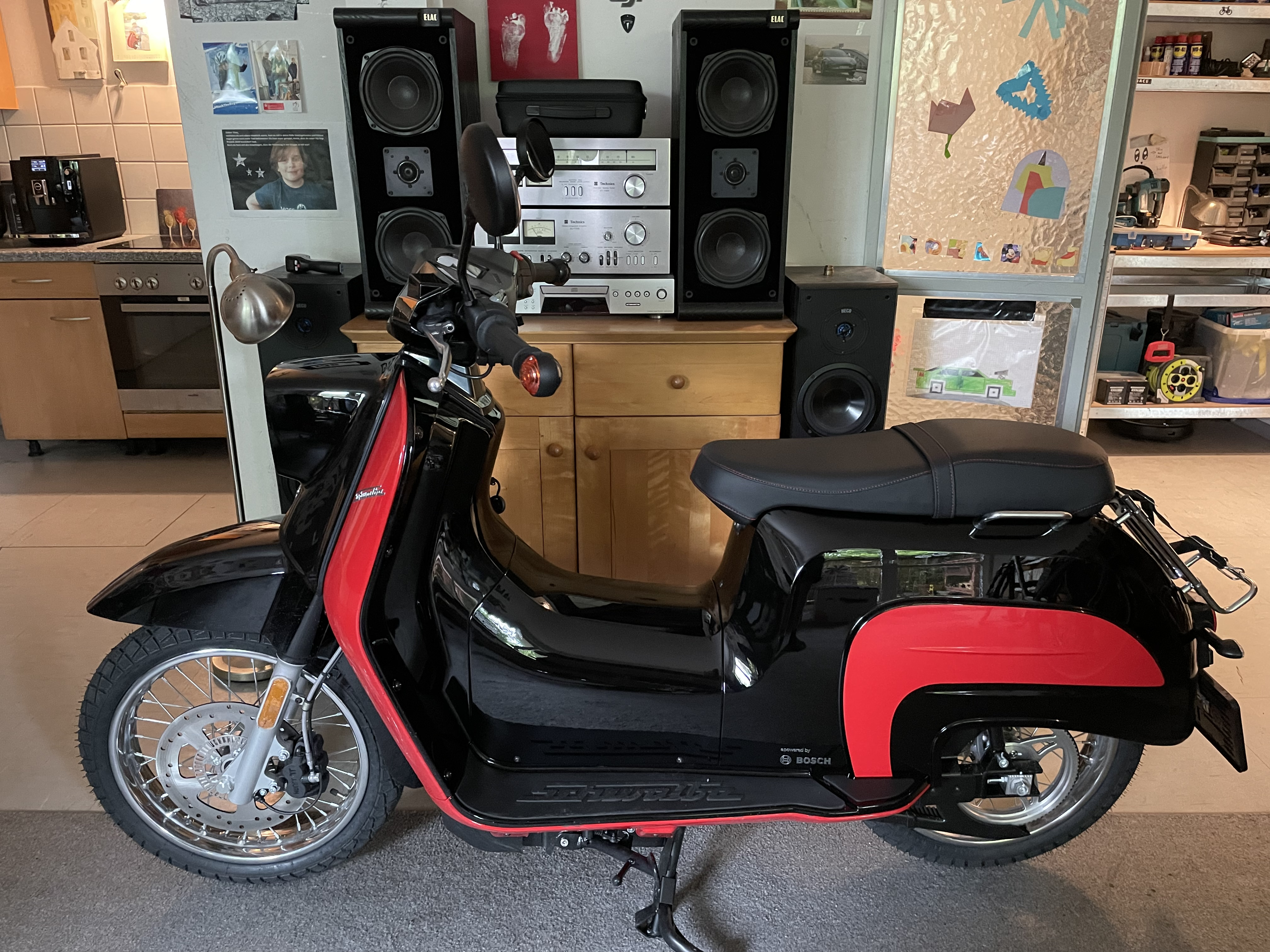 Schöner Bericht! Es gibt viel Werbung für die E-Schwalbe durch die Medien. Aber verkaufen scheint sie sich nur mäßig, wie mir scheint. Ladeproblematik und Preis. Bei der 45er gibt es deutlich günstigere auch gute Sachen als Alternative. (Hatte zum Beispiel einen kleinen Super Soco Cux, der lief auch gut und kostete die Hälfte. Allerdings gibt es in der L3E Klasse nichts wesentlich günstigeres. Vor allem aber nichts mit dieser Leistung von 8 kw! Ich hatte vorhin auf der Überführungsfahrt Tacho 96 drauf! Ich bin vor ein paar Wochen auch den Super Soco CPX gefahren, der war ne lahme Ente! Für mich persönlich war es die beste Wahl. Weil sie groß ist und ich groß bin. Und weil ich eine Erdgeschosswohnung Wohnung habe, wo ich sie reinschiebe.