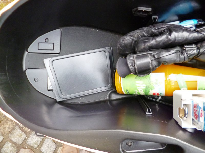 Damit mir die Handschuhe und die Einkäufe nicht immer ins Helmfach rutschen, habe ich mir eine Unterteilung gedruckt. Links und rechts wird ein U-Profil angeklebt (3M VHB Doppelklebeband) und in die beiden Profile wird dann von oben eine Platte eingesteckt. Alles jederzeit rückstandslos wieder entfernbar. Man kann natürlich auch Heißkleber nehmen.