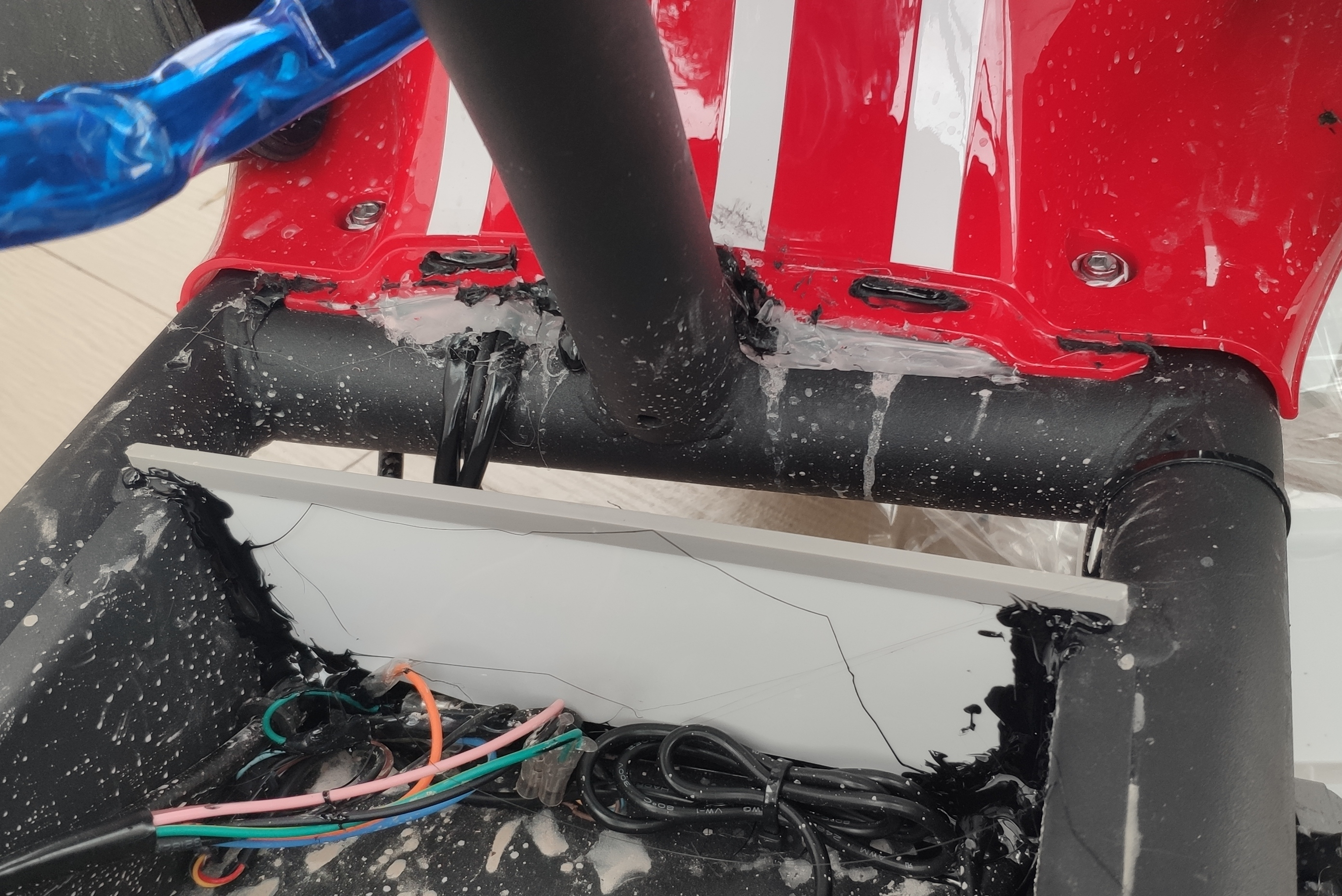 Dann alles mit Heißkleber zugekleistert, biss es wasserdicht schien. Oben auf dem rahmen habe ich Dichtungsstreifen für fenster verbaut. An der unteren abdeckung vorne (und bei den grossen öffnungen) mehr heisskleber.