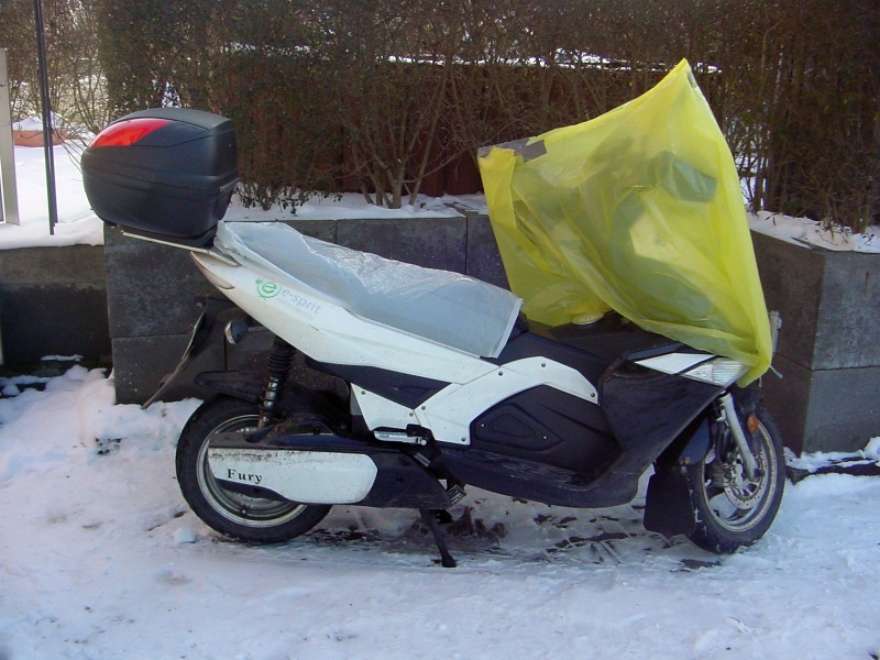 Vor einigen Monaten begann ich, experimentell mit einer großen Reifentüte nur Lenker und Frontschild zuzuhängen. Die Tüte war etwas zu schmal, aber die Wirkung war gut - bis in einer stürmischen Nacht die Tüte das Weite suchte und fand. Dann überkamen mich wilde Phantasien einer zeltplanenbewerten Motorradgarage, aber die Herbst-, Winter- und Frühjahrsstürme hier auf der Filderebene sowie der nicht unbeträchtliche Platzbedarf und der noch beträchtlichere Preis hielten mich dann doch davon ab.