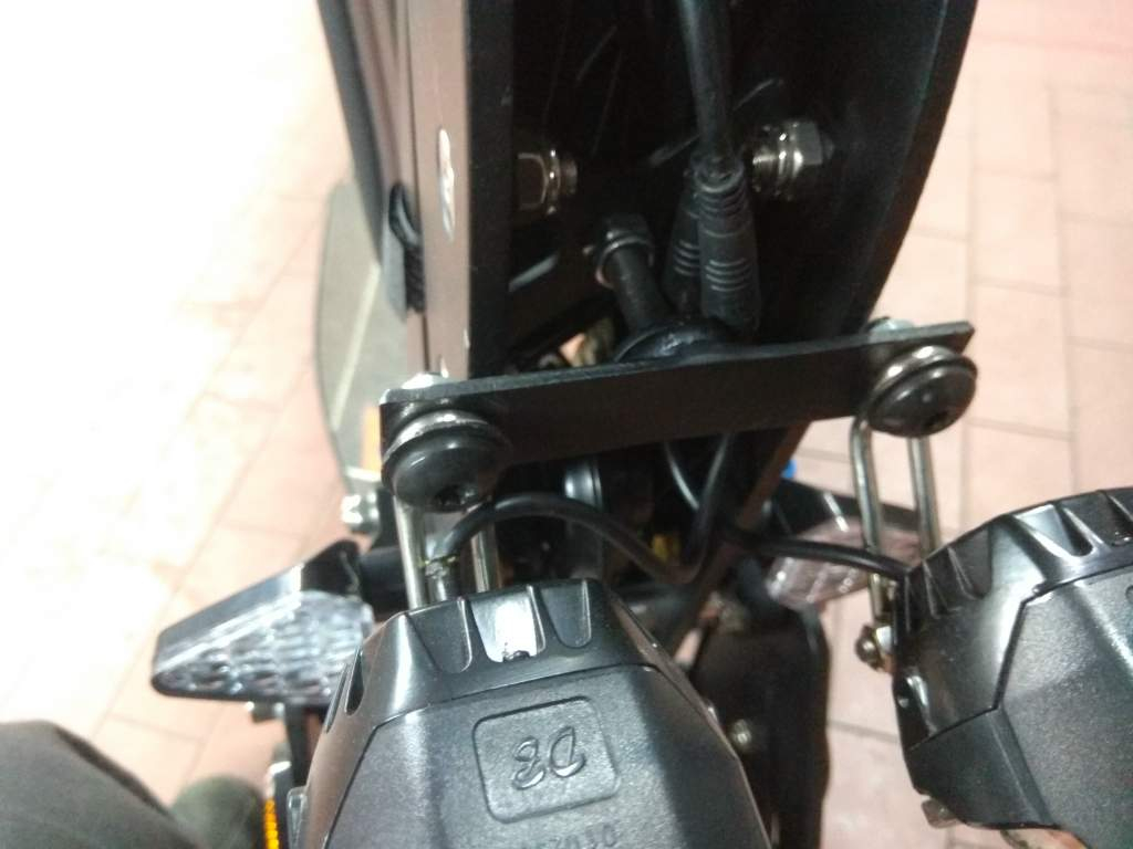 ich hab einfach ein stück flacheisen was ich auf arbeit noch rumzuoxidieren hatte genommen und auf passende länge geschnitten, an die enden zwei löcher gebohrt wo ich die lampen anschrauben kann. dann mittig eine passend lange schraube geschweißt. um das ganze in das originale loch im scooter zu stecken und dann das ganze nur mit zwei muttern festgeschraubt. die eine mutter als anschlag und die andere zum festschrauben. das ganze noch schwarz lackiert und fertig. ich mach dir mal noch eine nahaufnahme