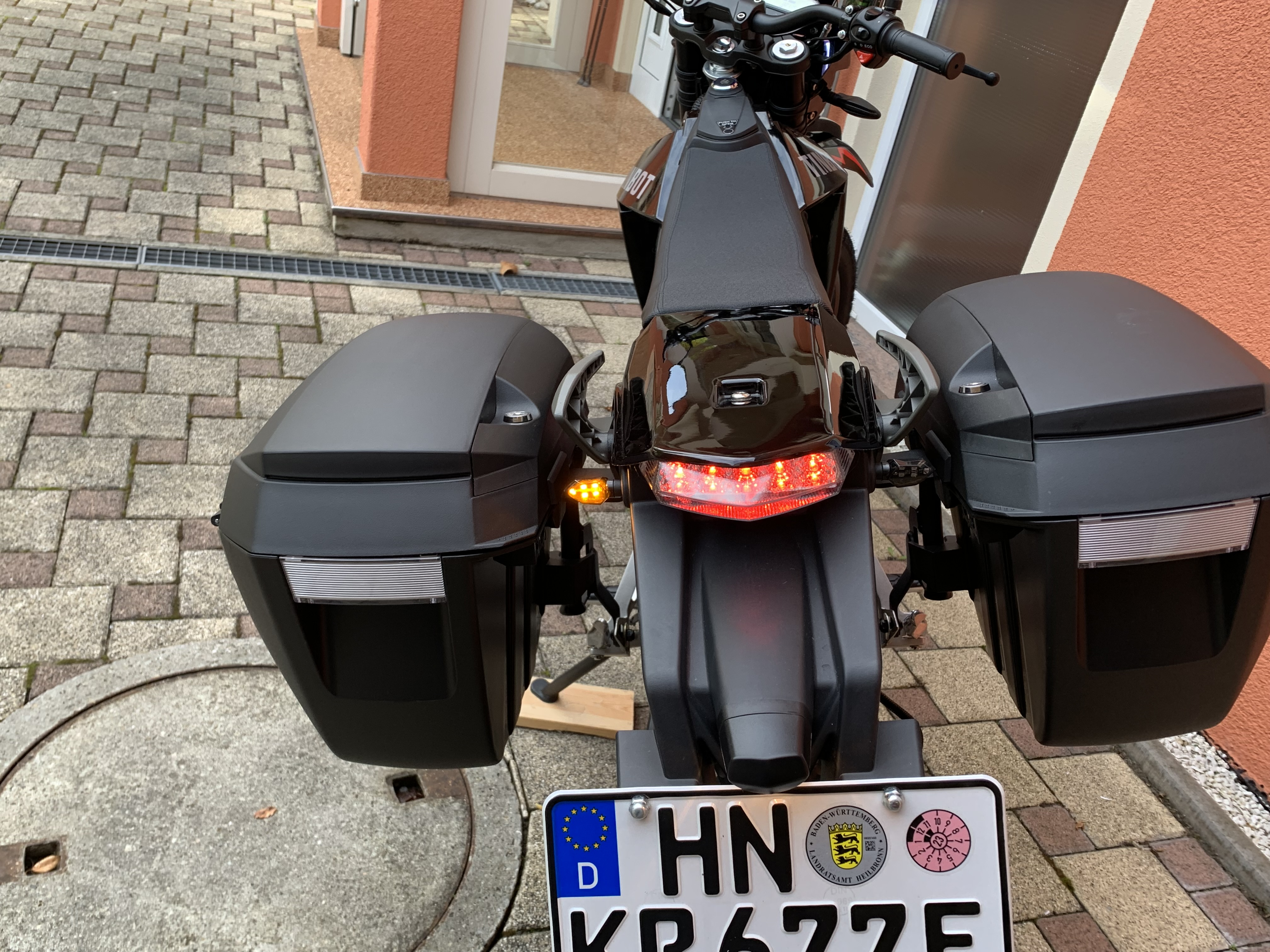 Ich habe mir 2Verlängerungkabel machen lassen und kann somit die 2 Ersatzakkus in den Gepäcktaschen benutzen ohne sie vorne einbauen zu müssen.
