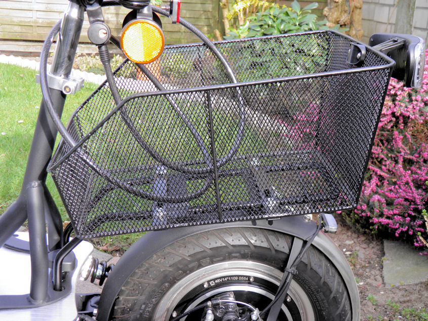 Gepäckträger mit großem Korb montiert.