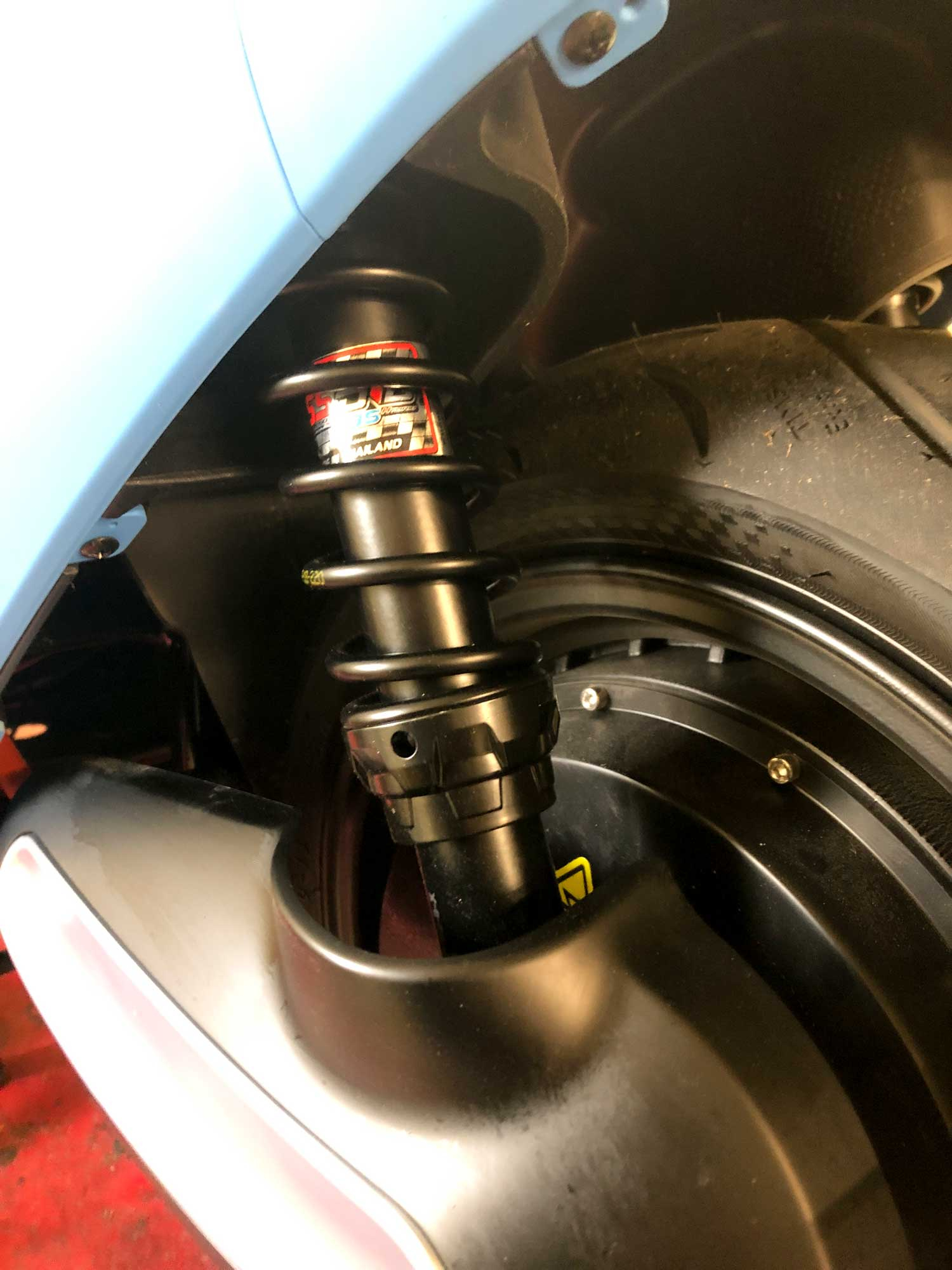 Normalerweise ist bei hinteren Federbeinen per Hakenschlüssel die Federvorspannung einstellbar. Bei Soziabetrieb muss sie stärker vorgespannt werden, so dass wieder der als Einzelfahrer gewohnte Federweg zur Verfügung steht.