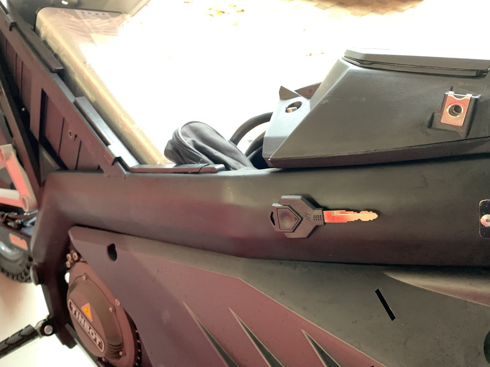 Bei meiner war sogar ein Zweitschlüssel dabei: So gefunden unter der rechten Verkleidung; befestigt mit Magnet am Rahmen.