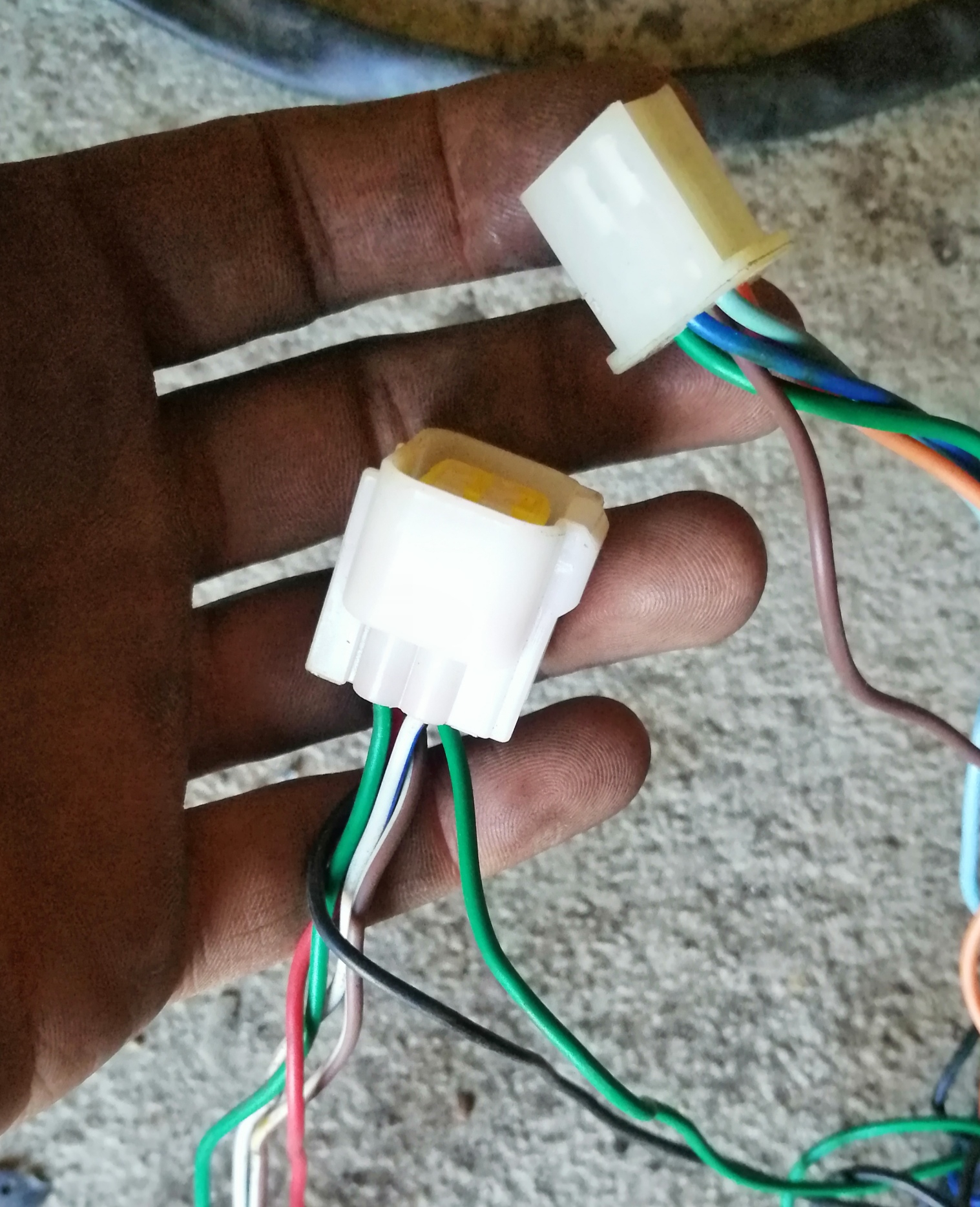 Der Stecker im Bild oben (blau, braun, grau, grün, orange) geht zur rechten Schaltereinheit und der im Bild unten (grün, grün, schwarz, rot, weiß-blau, weiß-rosa) geht zur Tachoeinheit.