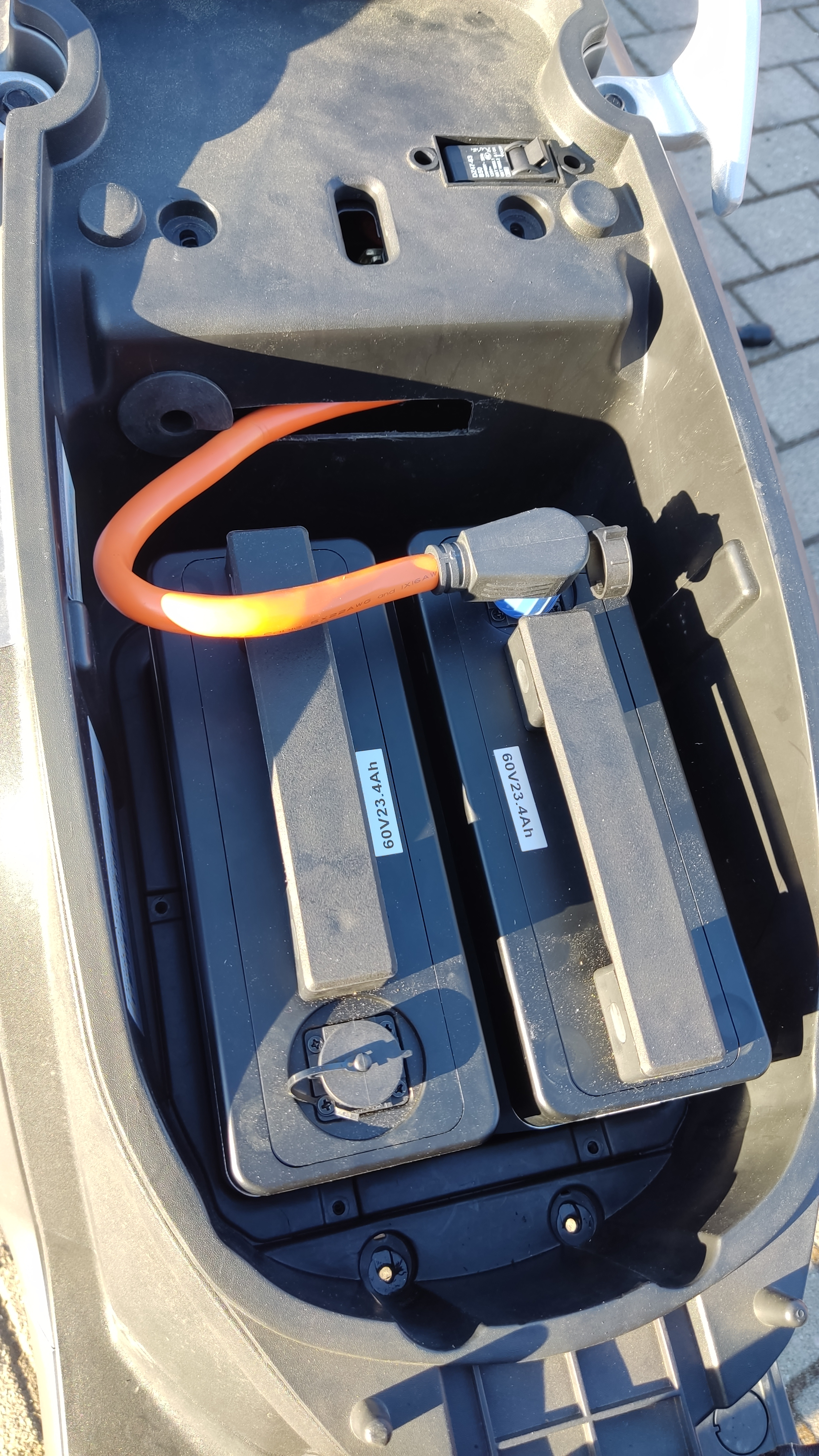wie bekannt habe ich seit kurzem einen INOA S5 Li von Nova-Motors. Gleich dazu bestellt habe ich einen 2. Akku. Nun musste ich aber feststellen, dass das Umstecken des Stromsteckers, wenn der 1. Akku während der Fahrt leer ist, nicht so ohne weiteres machbar ist.